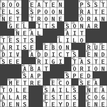ACROSS 1. Oct. 31 cry 4. Ingested 9. Inconspicuous attention getter 13. Raised railways 14. Soup utensil 15. Pace 16. Fish or hair follower 17. Marketplace scale 18. NW Algerian seaport 19. Set 21. It is 22. Underwater navigation system 24. Actress Patricia 26. Small island 27. Trials 29. _ and Stitch 30. Get up 31. Inky black, to poets 33. Sorrow 36. HTML Container Element 37. Inveterate users 40. Conclude 41. Perceive with the eye 42. Swiss mountan, "Queen of the Mountains" 43. Clothes sense 45. Blind as ____ 47. Constellation of myth 48. Plant excrement 49. Hurried 50. Distance measurement (Brit.) 52. Environmental prefix 54. Ocean 56. Lacquered or enameled metalware 57. Travels by water 59. Teachers' org. 61. Having or resembling wings 62. _____ Park, CO 63. Gear tooth 64. Lairs 65. Miss Universe 1986, Barbara Palacios _ 66. Compass dir. DOWN 1. Benjamin's nick name 2. Cassini of fashion 3. Clearly or manifestly demonstrative 4. Eastern Standard Time (abbr.) 5. Showery time 6. A blast of a horn 7. Immeasurably long periods of time 8. Compass dir. 9. Right away 10. "Two Mules for Sister ____" 11. Play the lead 12. Nine, plus one 20. Allows 22. Virtuous person 23. Lubricate 25. Toward the sea 27. Small amounts or degrees 28. One of the Great Lakes 29. Event scenes 31. Prepare for publication 32. Of large size 33. Dwelling 34. To (old English) 35. Locale of original sin 38. Window treatment 39. Discontinue 44. Ancient Greek god of war 45. Michaelmas daisies 46. Soap unit 49. Having a sole or soles 50. Undercover agent 51. Liveliness 52. Comfort 53. Municipality 55. A really long time 56. Small boy 57. Put into a specified state 58. Compass dir. 60. Ripen