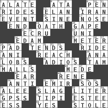 ACROSS 1. Having winglike extensions 6. _ moment's notice (2 wds.) 9. Animal enclosure 12. Amusement-park features 13. Enthusiasm 14. SW Asia republic 15. Happening 16. Trig term 17. Characteristic smell of wine 18. Conclusion 19. Pledge 20. Open wide 21. Shade of tan 23. University (slang) 24. Dutch treat 25. Distance measurement 28. Writing tablet 30. Looks after 34. Travel on an animal 35. Cuckoo 36. Arrive at 38. Santa ___, CA 39. Tennis shots 41. Goodbye (Sp.) 43. Scottish cap 44. Promenades 46. Ancient Persian 48. Ewer handle 49. French philosopher Descartes 50. Against 51. Independent ruler or chieftain 53. Distress signal 56. Toward shelter 57. Volcanic refuse 58. 61 cubic inches 60. Global Positioning Systems (abbr.) 61. Native american tent (variation) 62. First name in cosmetics 63. Curvy letter 64. Affirmative reply 65. Fur scarf DOWN 1. "We ___ not amused" (Victoria) 2. Moving, as bait 3. An important port of Yemen 4. Looked after 5. Eastern Standard Time (abbr.) 6. Came down and settled, as after flight 7. Hyperbolic tangent 8. One (Scot) 9. Appease 10. Comfort 11. Compass dir. 13. He sold his birthright 14. More lacking in sense or substance 19. Abalone 20. Chewing product 22. Feline 24. The property of being fit to eat 26. Pulitzer Prize-winning author Ferber 27. 480, 500 or 516 sheets of paper 28. Inside of hand 29. Small Philippine buffalo 31. Teachers' org. 32. Male parent 33. _-fi 37. Home run 40. Chalkboards 42. Elected rep. 45. Indian title of respect (Mr.) 47. Stop 49. Swiss mountan, "Queen of the Mountains" 50. High mountains 51. Writer Wiesel 52. Atlas contents 54. Von Bismarck 55. Stitch closed the eyes of (a falcon) 56. Ripen 57. Filthy place 58. French article 59. To sift