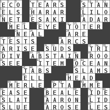 ACROSS 1. Environmental prefix 4. Lacerates 9. Comedian Laurel of Laurel & Hardy 13. Raised railways 14. Ethiopian city, capital of Harari 15. _ and Stitch 16. Fish or hair follower 17. 1973 Nobel Price Winner (Physics) Leo 18. The sixth month of the Jewish calendar 19. Cartoonist voice _ Blanc 21. Sight organ 22. Carrier 24. Anneal 26. "We ___ not amused" (Victoria) 27. Trials 29. Arches 30. Ascend 31. Soap bubbles 33. Three (prefix) 36. HTML Container Element 37. Choose not to consume 40. Friend of Pooh 41. Observe 42. A distinct part 43. Sea 45. Bar bills 47. Criticizes harshly 48. Pipe bend 49. Froth on beer 50. Haggard of country music 52. Parent Teacher Assoc. 54. Madame (abbr.) 56. Relaxation 57. Calif. Air Force Base 59. Binary compound 61. Narrow board 62. Composer Copland 63. Flaplike covering 64. Change direction abruptly 65. Came up 66. French article DOWN 1. Car or cant ending 2. Clement's nick name 3. Clearly or manifestly demonstrative 4. Definite Article 5. Artist's stand 6. Like ___ of sunshine 7. Immoral or dissolute person 8. Indian title of respect (Mr.) 9. Chalkboards 10. Event that recurs at intervals 11. Having or resembling wings 12. Not either 20. Allows 22. Tarsus (plural) 23. The grampus (Milton) 25. Toward the sea 27. Small boys 28. 4th largest of the Great Lakes 29. First man 31. Fast planes 32. Shoshoni 33. Excercise machine 34. Wander 35. Charged atoms 38. The Good Book 39. Characteristic smell of wine 44. Dollar (slang) 45. Cylindrical with tapered ends 46. Everything 49. Rings 50. Promenade 51. He sold his birthright 52. Lightbulb-shaped fruit 53. Pacific island yam 55. Singer Brickell 56. Double-curved letter 57. Sound made by sheep 58. Compass dir. 60. Begley and Asner