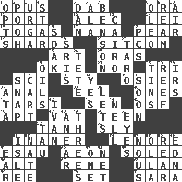 ACROSS 1. Musical composition 5. Pat or tap gently 8. Mouth or opening 11. Sweet dark-red dessert wine 12. Actor Baldwin 14. Flowery wreath 15. Ancient Roman robes 17. Nanny 18. Lightbulb-shaped fruit 19. Broken pieces 21. "Cheers" or "Ellen" 23. Tate display 25. Mouths or openings 26. Migrant worker of the '30s 27. And not 28. Three (prefix) 31. _-fi 33. Filthy place 35. Flexible twig of a willow tree 37. Of or related to the anus 38. Snakelike fish 40. Washington bills 41. Tarsus (plural) 43. Elected rep. 45. Order of Saint Francis (abbr.) 46. Fitting 47. Large container 50. Adolescent 52. Hyperbolic tangent 53. Playfully artful 54. More empty; more void 56. Poe poem 61. He sold his birthright 62. Period of immesurable duration 65. Having a sole or soles 66. The first octave above the treble staff 67. French philosopher Descartes 68. Uhlan (variant) 69. Portuguese money of account (variant) 70. Arrange properly for use 71. "Two Mules for Sister ____" DOWN 1. Chooses 2. "Silly old bear" 3. Capital and largest city of Mongolia 4. Play the lead 5. Daniel's nick name 6. Wing 7. Gillaume's butler role 8. Butter sub 9. 480, 500 or 516 sheets of paper 10. Atmosphere 13. Capital of Egypt 16. Neighbor of Neb. 18. Personal Computers (abbr.) 20. Indian titles of respect 22. Edible starchy tuberous root 24. Wig 26. Lubricates 28. Metal containers 29. Coral collection 30. Big collection agency 31. Fastener 32. Haul 34. Affirmative reply 36. Within a short period 37. _ moment's notice (2 wds.) 39. Allows 42. "Terrible" tsar 44. 1994 drama film starring Jodie Foster 48. Approach 49. Triads 51. Sight organs 52. The 19th letter of the Greek alphabet 54. Capri or Wight 55. Nathan's nickname 57. Horse sense 58. Water jar 59. Tail end 60. Pulitzer Prize-winning author Ferber 61. Ewer handle 63. Single 64. Remaining after all deductions