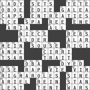 ACROSS 1. Kenny Rogers chart-topper in '80 5. Puts into a specified state 9. Wig 13. Mitch Miller's instrument 14. Singer Brickell 15. An organ shaped like a helmet 16. Smile enhancers 17. Pleas 19. Frozen water 20. Health resort 21. To separate or throw off 22. Compass dir. 23. Roberta Peters solo 25. Everything 26. Sibling's daughter 30. Confederate soldiers (slang) 34. Tree or shrub in the Birch family 35. Having or resembling wings 36. Chow _ 39. Boozer 42. Swiss mountan, "Queen of the Mountains" 43. Queen of England 1702-14 44. High-altitude cloud 46. Russian ruler of old 47. Distinguishing feature 48. Chief or king in Benin or Nigeria 51. Colored 54. Purpose 57. Hit sharply and swiftly 58. Compete 60. Zeal 62. Complicated, petty procedures 65. Trig term 66. Satellite of Uranus 67. It's straight from the horse's mouth 68. Comedian Laurel of Laurel & Hardy 69. For fear that 70. Portable shelter 71. Armed conflicts DOWN 1. Event scenes 2. Phillipine bananalike plant 3. Drug addict 4. Consenting reply 5. Ooze 6. Pulitzer Prize-winning author Ferber 7. Teat (slang) 8. Father Junipero _ 9. Make lace 10. Writer Wiesel 11. Adolescent 12. Relaxation 15. Highlander 18. Snakelike fish 20. Travel by water 24. More empty; more void 27. Begley and Asner 28. Corporate head (abbr.) 29. Spew [out] 30. Noteworthy scarcity 31. Biblical high priest 32. Container for groceries 33. _ Lanka 36. Floor protector 37. Followers of ems 38. _ tizzy (2 wds.) 40. Title for a knight 41. Period 45. Travel on an animal 48. Relating to the mouth 49. Long, evenly shaped piece 50. To the left, to Queeg 52. Webber/Rice musical 53. Middle Eastern gold or silver currency 54. Mountain range 55. The founder of a family 56. The front part of a cuirass 58. Distinctive style or manner 59. Is not 61. Not women's 63. Was introduced to 64. Area sheltered from the wind 65. Compass dir.