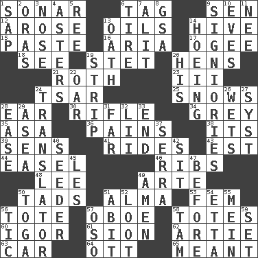ACROSS 1. Underwater navigation system 6. Label 9. Elected rep. 12. Came up 13. Lubricates 14. Hub of activity 15. Thick mixture 16. Roberta Peters solo 17. Double curve, resembling the letter S 18. Observe 19. Proofreading order 20. Coop moms 21. Writer of Portnoy's Complaint (1969) 23. One more than two 24. Russian ruler of old 25. Frozen precipitation (plural) 28. Ewer handle 30. Firearm 34. Jennifer or Joel 35. White ___ sheet 36. Aches 38. ___ a Wonderful Life 39. Elected reps. 41. Amusement-park features 43. Eastern Standard Time (abbr.) 44. Artist's stand 46. Teases 48. Area sheltered from the wind 49. Johnson of "Laugh-In" 50. Small boys 51. _ mater 53. Opposite of masc. 56. Lug 57. Mitch Miller's instrument 58. Hauls 60. Russian composer Stravinsky 61. The Jewish people; Israel 62. Nick name for Arthur 63. 4-wheeled motor vehicle 64. Baseball player Mel 65. Intended DOWN 1. Plant excrement 2. Mouths or openings 3. Olfactory organ 4. Michaelmas daisies 5. To separate or throw off 6. Hoop that covers a wheel 7. Came down and settled, as after flight 8. Girls' org. (abbr.) 9. Seigniories (variant) 10. Nights before holidays 11. Born 13. Pledge 14. Weeding 19. Empty completely 20. Part of HMS, perhaps 22. Boat paddle 24. Interpreter 26. Soaks 27. System (abbr.) 28. Comfort 29. At sea 31. Distant 32. Cards in a Roman deck? 33. Conclusion 37. Father Junipero _ 40. Sowing specialist 42. Be seated 45. French article 47. Prior to 49. So be it 50. Ancient Roman robe 51. "This won't hurt ____!" 52. Spoils 54. Singer James 55. Count _ (2 wds.) 56. Nervous spasm 57. Bear (Spanish) 58. Scottish cap 59. Arrange properly for use