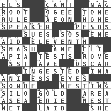 ACROSS 1. Raised railways 4. Patter 8. Tired old horse 11. Carrot, for example 13. Double curve, resembling the letter S 14. Heavy book 15. Court order 16. Period of immesurable duration 17. Dwelling 18. Orator 21. Mexican monetary units 22. Institutes legal proceedings 23. Mayday 25. Compass dir. 26. Help 29. Veterans Day date 32. Box-office sellout 34. One (Scot) 35. Biblical high priest 38. Capital of Western Samoa 39. Trials 41. Be footloose 43. Fast jet (abbr.) 44. "___ Maria" 45. Witty Wilde 46. Swallowed 50. _ tizzy (2 wds.) 51. Cuckoo 54. Curvy letter 55. Sight organs 57. Something which is sent 59. Inhabiting a nest 63. Grain storage tower 64. Gilded 67. Type of rug 68. Toward the sea 69. 4th largest of the Great Lakes 70. Egg locale 71. Was introduced to 72. Put down 73. A female animal or person DOWN 1. Blunders 2. Central Nebraska county 3. Not divided or shared with others 4. Unrefined 5. Personal question 6. Modern: prefix 7. "___ Little Indians" 8. Trap for birds or small mammals 9. ID or VA city 10. Honkers 12. Beverages made from leaves 14. Definite Article 19. Malaysian steamed pastry 20. Snakelike fish 21. Pacific Standard Time (abbr.) 23. Posted 24. Washington bills 26. White ___ sheet 27. Naughty children 28. Raised platform 30. Flower holders 31. Possessive pronoun 33. Suttee (variant) 36. Event scenes 37. "Terrible" tsar 39. Labels 40. Nights before holidays 42. Epoch 45. Lyric poems 47. Born 48. Looked after 49. Sight organ 51. Indian state 52. Annoying sound 53. An arm off of a larger body of water 56. Comedian Laurel of Laurel & Hardy 58. ___ good deed 60. Angers 61. Soft 62. Yard entry 64. Set 65. Mouth or opening 66. Cards in a Roman deck?
