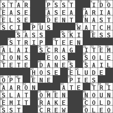 ACROSS 1. Play the lead 5. Inconspicuous attention getter 9. Wedding promise 12. Comfort 13. Toward the sea 14. Roberta Peters solo 15. Otherwise 16. Gouge 17. Political cartoonist Thomas 18. _-fi 19. Fluid product of inflammation 21. Observe 22. Backtalk 24. What Jean-Claude Killy likes to do 26. Curvy letter 27. Long narrow piece of something 28. Adolescent 29. Jai _ 30. Strangle with an iron collar 32. A distinct part 36. Charged particles 37. Greek goddess of the dawn 38. Not divided or shared with others 39. False hair 40. Natives or inhabitants of Denmark 42. Travel by water 43. Stockings 44. Evade 46. Elect 49. Compass dir. 50. Sliced desserts 51. Composer Copland 53. Had dinner 54. Three (prefix) 57. Narrow board 58. Sign of something about to happen 61. Part of speech 62. Send forth 63. Immoral or dissolute person 64. Having a low temperature 65. Fast jet (abbr.) 66. Ship's personnel 67. Butter sub DOWN 1. Perceives with the eye 2. Baby powder 3. Aide 4. To sift 5. Writing tablets 6. Compass dir. 7. Elected rep. 8. Make lace 9. Feeling or showing extreme anger 10. Plates 11. Expletives 14. Santa ___, CA 19. 23rd letter of the Greek alphabet 20. United States Postal Service (abbr.) 21. Victory 23. Ascend 24. Gospel singer Marvin 25. Barrel 27. A type of plum 28. Marketplace scale 29. Small island 31. Desist 32. Come out of 33. Inedible or poisonous agaric 34. Writer Wiesel 35. Cartoonist voice _ Blanc 40. Spanish title 41. Back-to-school mo. 43. Layer 45. Untruth 46. Fertile tracts in a desert 47. Insides of hands 48. Distinguishing feature 52. Baseball player Mel 53. Afresh 55. Governing power 56. Southeast Asian peninsula 58. The grampus (Milton) 59. Spoil 60. Supplement with great effort 61. Non-commissioned officer (abbr.)