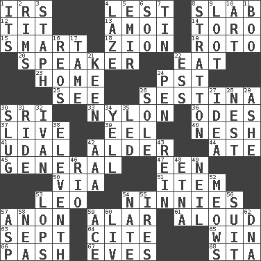 ACROSS 1. Big collection agency 4. For fear that 8. Broad, flat, thick piece 12. Teat (slang) 13. Mine, in Marseilles 14. "Corrida" creature 15. Don Adams' spy role 18. The Jewish people; Israel 19. Printing process, for short 20. Orator 22. Ingest 23. Dwelling 24. Pacific Standard Time (abbr.) 25. Perceive with the eye 26. French poetic form 30. Indian title of respect (Mr.) 33. Thermoplastic polyamide 36. Lyric poems 37. Moving, as bait 39. Snakelike fish 40. Delicate 41. Freehold land 42. Tree or shrub in the Birch family 44. Had dinner 45. Commissioned military rank 47. Car or cant ending 50. By way of 51. A distinct part 53. Lion 54. Fools 57. At once, immediately (arch.) 59. Having or resembling wings 61. Verbally 63. Back-to-school mo. 64. Quote 65. Victory 66. Romantic infatuation 67. Nights before holidays 68. R.R. building DOWN 1. It is 2. Basketball hoops 3. Staphylococcus 4. Goldbrick 5. Independent ruler or chieftain 6. "Barney Miller" actor Jack 7. Metal container 8. Ski resort town in Vermont 9. Spoils 10. Tate display 11. Sometimes accompanies a hiss 16. Vintage cars 17. Docile 21. Peachy ____! 22. Double-curved letter 24. Writing instrument 26. Not divided or shared with others 27. The content of cognition 28. A home for chicks 29. American tennis player Robert 30. A hard, heavy blow 31. Travel on or in a vehicle 32. _ the terrible 34. Shout 35. Directed 38. Veterans Day date 42. Auto club (abbr.) 43. It's straight from the horse's mouth 46. River (Sp.) 48. Inactive volcano in Sicily 49. Famous astronaut Armstrong 52. Catcalls? 53. Chops off 54. Nathan's nickname 55. Angers 56. Set of matching outer garments 57. Cleo's killer 58. Teachers' org. 59. Adept person 60. 54 in ancient Rome 62. Heredity factor (abbr.)