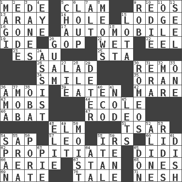 ACROSS 1. Ancient Persian 5. Burrowing marine mollusk 9. Vintage cars 13. Like ___ of sunshine 14. Opening into or through something 15. Inn 16. Went 17. Form of transportation 19. Binary compound 20. Republican Party 21. Dripping 22. Snakelike fish 23. He sold his birthright 25. R.R. building 26. First course 30. San ____ (Riviera town) 34. Grin 35. Northwest Algerian city 36. Mine, in Marseilles 39. Ingested 42. Female horse 43. Disorderly crowds 44. Learning spot: Fr. 46. Blind as ____ 47. Cowboy competition 48. Shade tree 51. Russian ruler of old 54. Plant excrement 57. Lion 58. Big collection agency 60. Flaplike covering 62. Appease 65. "You Light Up My Life" star Conn 66. Nest on high 67. Comedian Laurel of Laurel & Hardy 68. Washington bills 69. Nathan's nickname 70. Falsehood 71. Delicate DOWN 1. Wise men 2. Wear away 3. Natives or inhabitants of Denmark 4. Sight organ 5. US Secretary of Labor Elaine L. _ 6. Central Nebraska county 7. Keyboard modifier key 8. Catcalls? 9. Director Reiner 10. Singer Brickell 11. Stare 12. Stitch closed the eyes of (a falcon) 15. Globular water bottle used in Asia 18. Was introduced to 20. Island territory of the United States 24. Help 27. Whopper 28. Insect wing 29. Prevent from occurring 30. Lover boys 31. Epoch 32. Impair 33. Single 36. Nanny (var.) 37. Disorderly crowd 38. Chief or king in Benin or Nigeria 40. Environmental prefix 41. Lower and raise head in agreement 45. Allows 48. Writer Wiesel 49. Allow 50. Damp 52. Place in a line 53. Amusement-park features 54. Connect, as a bridge 55. Length times width 56. Left side of a ship or aircraft 58. Slanted text style (abbr.) 59. French philosopher Descartes 61. Food container 63. Sliced dessert 64. _ moment's notice (2 wds.) 65. Spanish title