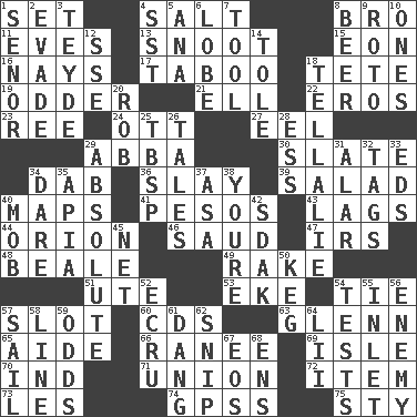 ACROSS 1. Put into a specified state 4. Table seasoning 8. Sis' sibling 11. Nights before holidays 13. Snout, nose 15. A really long time 16. Negative votes 17. Off limits 18. Wig 19. More peculiar 21. Pipe bend 22. Greek god of love 23. To separate or throw off 24. Baseball player Mel 27. Snakelike fish 29. Swedish rock group 30. Schedule 34. Pat or tap gently 36. Kill 39. Vegetable dish 40. Atlas contents 41. Mexican monetary units 43. Straggles 44. Greek mythologigal hunter 46. Saudi Arabian king (1953-1964) 47. Big collection agency 48. Calif. Air Force Base 49. Immoral or dissolute person 51. Shoshoni 53. Supplement with great effort 54. Make a knot 57. Narrow opening 60. Music discs 63. American astronaut and politician John 65. Assistant 66. Indian princess (variant) 69. Capri or Wight 70. Indiana (abbr.) 71. The state of being joined or united 72. A distinct part 73. French article 74. Global Positioning Systems (abbr.) 75. Filthy place DOWN 1. Sir (Sp.) 2. Dodge 3. Miss Universe 1986, Barbara Palacios _ 4. Fast jet (abbr.) 5. Santa ___, CA 6. Ear part 7. Instrument 8. Fermented drink made from hops 9. Printing process, for short 10. Singles 12. Compass dir. 14. Lacquered or enameled metalware 18. Copy Pinocchio 20. Director Reiner 25. Cook's measure (abbr.) 26. Stories 28. Curvy letter 29. Utter; complete 31. Having or resembling wings 32. Labels 33. Begley and Asner 34. Have the gumption 35. Capital of Western Samoa 37. White ___ sheet 38. You are 40. Crowd into 42. Neighbor of Neb. 45. Fish or hair follower 50. Cask 52. Shade of tan 54. Trials 55. An arm off of a larger body of water 56. Foe 57. Move on water 58. Actor's bit 59. Likelihood 61. Mild oath, euphamism for damn 62. Clip 64. Cards in a Roman deck? 67. Greek goddess of the dawn 68. Followers of ems