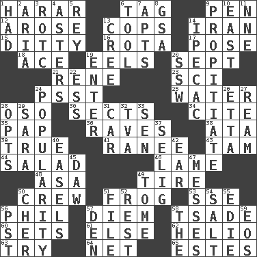 ACROSS 1. Ethiopian city, capital of Harari 6. Label 9. Animal enclosure 12. Came up 13. 911 reaches them 14. SW Asia republic 15. Short, simple song 16. Round or rotation of duties 17. Introduce or present, as a question 18. Adept person 19. Snakelike fish 20. Back-to-school mo. 21. French philosopher Descartes 23. _-fi 24. Inconspicuous attention getter 25. Wetness 28. Bear (Spanish) 30. Religious groups 34. Quote 35. Infant food 36. All-night dance parties 38. "One Day ___ Time" 39. Loyal 41. The wife of a rajah (variant) 43. Scottish cap 44. First course 46. Unable to walk 48. White ___ sheet 49. Become fatigued 50. Ship's personnel 51. Tree-dwelling hopper 53. Compass dir. 56. Silvers or Donahue 57. South Vietnam president (1954) 58. Sadhe (variant) 60. Puts into a specified state 61. Otherwise 62. Sun: prefix 63. Attempt to accomplish something 64. Fish or hair follower 65. _____ Park, CO DOWN 1. Possessed 2. Roberta Peters solo 3. College mil. group 4. Michaelmas daisies 5. Marina Del _, California 6. Instrument 7. Flats, for short 8. Girls' org. (abbr.) 9. Conciliate 10. Compass direction 11. Compass dir. 13. Algonquian 14. Medicinal drug used to evoke vomiting 19. Keyboard key 20. Compass dir. 22. Double-curved letter 24. Teen's desire 26. Singer James 27. 480, 500 or 516 sheets of paper 28. Elects 29. "Two Mules for Sister ____" 31. Automobile 32. Federal power corp. 33. Elected rep. 37. Major League Baseball Commissioner Bud 40. Artist's stands 42. Ewer handle 45. Obsolete 47. Makes clutter 49. Heavy book 50. "Mermaids" star 51. Do some clerical work 52. Respite 54. Table seasoning 55. Singer Brickell 56. Pacific Standard Time (abbr.) 57. Lair 58. Definite Article 59. Greek goddess of the dawn