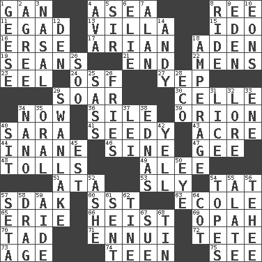 ACROSS 1. Separate the seeds from cotton 4. At sea 8. To riddle 11. Mild oath 13. Country residence 15. Wedding promise 16. Celtic language 17. Believer in; advocate of (suffix) 18. An important port of Yemen 19. Actors Connery and Penn 21. Conclude 22. Not women's 23. Snakelike fish 24. Order of Saint Francis (abbr.) 27. Slangy assent 29. Fly high 30. Cell (Danish) 34. Immediately 36. Drop; flow; fall 39. Greek mythologigal hunter 40. "Two Mules for Sister ____" 41. Shabby and untidy 43. Measure of real estate 44. Empty; void 46. Trig term 47. Turn to the right 48. For Whom the Bell _____ 49. Toward shelter 51. "One Day ___ Time" 53. Stealthy 54. Make lace 57. Neighbor of Neb. 60. Fast jet (abbr.) 63. Learning spot: Fr. 65. 4th largest of the Great Lakes 66. Robbery 69. Brightly colored fish 70. Bit 71. World-weariness 72. False hair 73. Ripen 74. Adolescent 75. Perceive with the eye DOWN 1. Honkers 2. Match 3. Relating to the nose 4. Actress Gardner 5. Title for a knight 6. Writer Wiesel 7. Actor Alda or Thicke 8. Travel on or in a vehicle 9. Genesis locale 10. Immeasurably long periods of time 12. Lair 14. Actor Griffith 18. Electrical Measurement 20. "Barney Miller" actor Jack 25. Backtalk 26. Strips of potato fried in deep fat 28. Environmental prefix 29. Tchaikovsky ballet 31. Louse (plural) 32. Old wives' tales, e.g. 33. Compass dir. 34. Billionth: prefix 35. Taken by mouth 37. Luau accessory 38. Ferber et al. 40. Be seated 42. Shout 45. Eastern Standard Time (abbr.) 50. Sight organ 52. American tennis player Robert 54. Drinks excessively 55. Having winglike extensions 56. Giggle 57. Bristle 58. To draw with force 59. Helper 61. Posted 62. Prong on a fork 64. Small bed 67. Take to court 68. Shallow baking pan