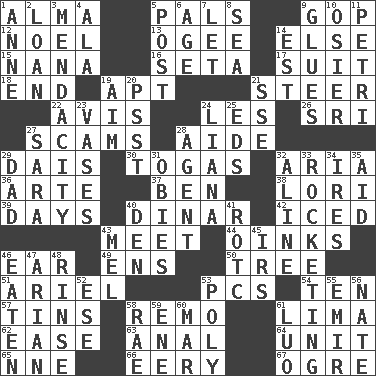 ACROSS 1. _ mater 5. Friends 9. Grand Old Party 12. Christmas carol 13. Double curve, resembling the letter S 14. Otherwise 15. Nanny 16. Stalk of a moss capsule 17. Set or collection 18. Conclusion 19. Fitting 21. Bull 22. Opinion 24. French article 26. Indian title of respect (Mr.) 27. Fraudulent business schemes 28. Helper 29. Raised platform 30. Ancient Roman robes 32. Operatic vocal solo 36. Johnson of "Laugh-In" 37. Benjamin's nick name 38. Australian parrot (variant) 39. 24-hour periods 40. Middle Eastern gold or silver currency 42. On the rocks 43. Confront 44. Pig sounds 46. Ewer handle 49. Followers of ems 50. Woody plant 51. Satellite of Uranus 53. Personal Computers (abbr.) 54. "___ Little Indians" 57. Canisters 58. San ____ (Riviera town) 61. Pale green bean 62. Comfort 63. Of or related to the anus 64. A single undivided whole 65. Compass dir. 66. Suggestive of the supernatural 67. Legendary monster DOWN 1. Queen of England 1702-14 2. Grant temporary use of 3. Ananias' fault 4. According to 5. Mail 6. Mature 7. Allow 8. Ocean 9. Cements 10. Flexible twig of a willow tree 11. _ dish (used to culture cells) 14. Eastern Standard Time (abbr.) 19. Direct toward a target or goal 20. Inconspicuous attention getter 21. Compass dir. 23. Flower holders 24. Woody, climbing, usually tropical plant 25. Begley and Asner 27. "Two Mules for Sister ____" 28. Representative 29. Male parent 31. Off-Broadway awards 32. Place in a line 33. Shooting up abruptly 34. Angers 35. Help 40. Lair 41. College mil. group 43. Cartoonist voice _ Blanc 45. Big collection agency 46. Eroded 47. Believer in; advocate of (suffix) 48. Wash lightly 52. Compass dir. 53. Many (prefix) 55. Arab leader 56. Nathan's nickname 58. Actress Charlotte 59. Compass dir. 60. Spoil 61. Nilotic language
