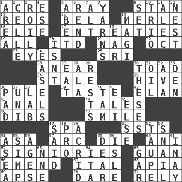 ACROSS 1. 1/640 square mile 5. Like ___ of sunshine 9. Comedian Laurel of Laurel & Hardy 13. Vintage cars 14. Actor Lugosi 15. Haggard of country music 16. Writer Wiesel 17. Pleas 19. Everything 20. It would 21. Tired old horse 22. Sep. follower 23. Sight organs 25. Indian title of respect (Mr.) 26. Approach 30. Frog relative 34. Lacking originality or spontaneity 35. Hub of activity 36. Whine 39. Clothes sense 42. Flair 43. Of or related to the anus 44. Lies 46. Claim 47. Grin 48. Health resort 51. Fast planes 54. White ___ sheet 57. Curve 58. Expire 60. Black tropical American cuckoo 62. Seigniories (variant) 65. Island territory of the United States 66. Make improvements or corrections to 67. Slanted text style (abbr.) 68. Capital of Western Samoa 69. Domed church section 70. Have the gumption 71. Depend DOWN 1. Length times width 2. Cell (Danish) 3. Turbulent 4. Compass dir. 5. Collude with 6. Tear apart 7. Keyboard modifier key 8. Tall tales 9. Put into a specified state 10. Musical group of three 11. Actor Baldwin 12. A home for chicks 15. Wise men 18. Hearing organ 20. Is not 24. Artist's stands 27. Ingest 28. In the manner of 29. Musical pauses 30. College papers 31. Lubricate 32. Actress Gardner 33. Lair 36. Groovy apt. 37. Single; one (prefix) 38. Experiment locale 40. Scottish cap 41. Biblical high priest 45. Otherwise 48. Expressed in words 49. Adept person 50. Bitter 52. Grayish beige 53. Slow-paced one 54. Toward the sea 55. Simple or foolish person 56. Eras 58. Letter starter 59. Capri or Wight 61. "If ____ say so..." 63. Compass dir. 64. Call ___ day 65. Slender fish