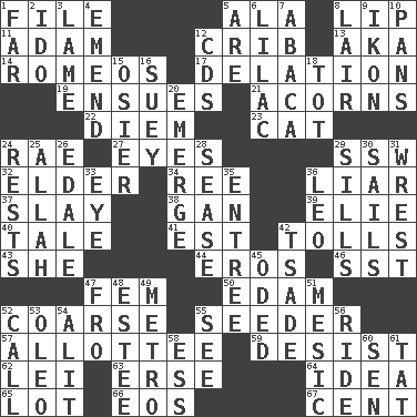 ACROSS 1. Do some clerical work 5. Chicken ___ king 8. Mouth edge 11. First man 12. Baby bed with high sides 13. Alias (abbr.) 14. Lover boys 17. Conveyance 19. Follows as a consequence or result 21. Oak nuts 22. South Vietnam president (1954) 23. Feline 24. Actress Charlotte 27. Sight organs 29. Compass dir. 32. A person who is older than you are 34. To sift 36. One who doesn't tell the truth 37. Kill 38. Separate the seeds from cotton 39. Writer Wiesel 40. Lie 41. Eastern Standard Time (abbr.) 42. For Whom the Bell _____ 43. A female animal or person 44. Greek god of love 46. Fast jet (abbr.) 47. Opposite of masc. 50. Dutch treat 52. Rough 55. Sowing specialist 57. One to whom something is allotted 59. Stop 62. Flowery wreath 63. Celtic language 64. It may be bright or harebrained 65. Car dealer's back yard 66. Greek goddess of the dawn 67. Penny DOWN 1. At a great distance 2. Wedding promise 3. Unable to walk 4. Make improvements or corrections to 5. "We ___ not amused" (Victoria) 6. Pale purple color 7. Phillipine bananalike plant 8. Den 9. Visual representation of an object 10. Baking dishes 12. Music discs 15. Flexible twig of a willow tree 16. Chop _ 18. Small child 20. Develop 24. Musical pauses 25. Assad's deity 26. Peak District village in England 28. Gospel singer Marvin 29. Beverly of Met fame 30. Travels by water 31. Take or capture by force 33. Sight organ 35. Main course 36. Lion 42. Sadhe (variant) 45. Wrote a lyric poem 47. Away 48. First name in cosmetics 49. Paris' subway 51. Mesonic 52. Give a ring to 53. Margarine 54. Set down 55. Observe 56. Travel on an animal 58. Double-curved letter 60. Elected rep. 61. Make lace