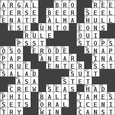 ACROSS 1. Therefore, facetiously 6. Sis' sibling 9. To riddle 12. Laconic 13. Fermented drink made from hops 14. Stitch closed the eyes of (a falcon) 15. Maternal 16. _ mater 17. Frame or body of a ship 18. Compass dir. 19. To (old English) 20. Immeasurably long periods of time 21. General guideline 23. Fr. "Yes" 24. Inconspicuous attention getter 25. Obstructs or blocks passage 28. Bear (Spanish) 30. Wear away 34. Fastener 35. Infant food 36. Approach 38. _ tizzy (2 wds.) 39. Loyal 41. Keyboard key 43. Fast jet (abbr.) 44. Vegetable dish 46. Set or collection 48. White ___ sheet 49. Proofreading order 50. Ship's personnel 51. Oceans 53. Possessed 56. Silvers or Donahue 57. Indonesian resort city 58. Corrects by punishment or discipline 60. Arranges properly for use 61. Taken by mouth 62. Ancient Celtic tribe of eastern Britain 63. Attempt 64. Victory 65. 2nd pers. sing. pres. of can (arch.) DOWN 1. Had dinner 2. French philosopher Descartes 3. Pate de foie ____ 4. Michaelmas daisies 5. Area sheltered from the wind 6. Waist strap 7. San ____ (Riviera town) 8. Mouth or opening 9. One who advocates reunion 10. Snakelike fish 11. Pipe bend 13. Object of repulsion 14. Yells 19. Extreme 20. Greek goddess of the dawn 22. Purpose 24. Teen's desire 26. Zero-star reviews 27. Argument over a trivial matter 28. Chooses 29. "Two Mules for Sister ____" 31. Single 32. Lair 33. Ingest 37. Musical pauses 40. Artist's stands 42. Regret 45. Simpleton 47. New York city 49. Move on water 50. "Mermaids" star 51. Indian skirt 52. Flair 54. So be it 55. Habitations of wild animals 56. Pacific Standard Time (abbr.) 57. Arrow shooter 58. Nervous spasm 59. Be seated