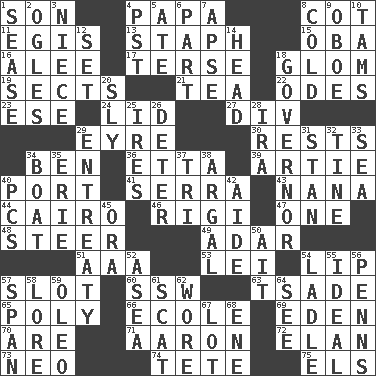 ACROSS 1. Male child 4. Dad 8. Small bed 11. Armor plate that protects the chest 13. Staphylococcus 15. Chief or king in Benin or Nigeria 16. Toward shelter 17. Laconic 18. Seize upon or latch onto something 19. Religious groups 21. Beverage made from leaves 22. Lyric poems 23. Compass dir. 24. Flaplike covering 27. HTML Container Element 29. Jane of fiction 30. Musical pauses 34. Benjamin's nick name 36. Singer James 39. Nick name for Arthur 40. Sweet dark-red dessert wine 41. Spanish missionary in California 43. Nanny 44. Capital of Egypt 46. Swiss mountan, "Queen of the Mountains" 47. Single 48. Bull 49. The sixth month of the Jewish calendar 51. Auto club (abbr.) 53. Flowery wreath 54. Mouth edge 57. Notch 60. Compass dir. 63. Sadhe (variant) 65. More than one (prefix) 66. Learning spot: Fr. 69. Paradise 70. "We ___ not amused" (Victoria) 71. Composer Copland 72. Enthusiasm 73. Modern: prefix 74. Wig 75. Raised railways DOWN 1. Gospel singer Marvin 2. Stares at amorously 3. Sibling's daughter 4. Pacific Standard Time (abbr.) 5. Had dinner 6. Piece 7. Domed church section 8. Having a low temperature 9. Mitch Miller's instrument 10. Scottish caps 12. Put into a specified state 14. Froth on beer 18. Head of state? 20. Playfully artful 25. Angers 26. Prevent from occurring 28. Retirement account (abbr.) 29. Plea 31. Comedian Laurel of Laurel & Hardy 32. Prong on a fork 33. Ocean 34. Water vessel 35. One of the Great Lakes 37. Three (prefix) 38. Therefore, facetiously 40. Personal Computers (abbr.) 42. Helper 45. Mouth or opening 50. Small island 52. At sea 54. Dipping utensil 55. Standard of perfection 56. Actor Sean's family 57. Connect, as a bridge 58. Old wives' tales, e.g. 59. Butter sub 61. Scram, to a cat 62. Had on 64. Perceive with the eye 67. Car dealer's back yard 68. Compass dir.