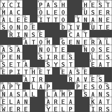 ACROSS 1. One more than ninety 4. Romantic infatuation 8. Behest 12. Big _ 13. Margarine 14. One who uses or employs something 15. Toward shelter 17. "Tell ____ the Marines!" 18. Empty; void 19. Something which is sent 21. HTML Container Element 23. Shoshoni 24. Wash lightly 26. Feline 28. Tiny particle 30. Commissioned military rank 34. White ___ sheet 37. Musical sound 39. Characteristic smell of wine 40. Fenced enclosure 41. Founders of families 43. French article 44. Stalk of a moss capsule 46. System (abbr.) 47. Consume 48. Curse 51. Relaxation 54. Wind 55. All-night dance parties 58. Fitting 61. Infant locale 63. Mexican monetary units 65. Relating to the nose 67. Desk light 71. Without 72. Flair 73. Length times width 74. Krazy ___ of comics 75. We are 76. Sharp bark 77. Big collection agency DOWN 1. Dec. holiday 2. Bodily heat indicating an inflammation 3. Ancient Celtic tribe of eastern Britain 4. Luau course 5. Keyboard modifier key 6. Arrange properly for use 7. Parka part 8. Attila the _ 9. He sold his birthright 10. Transmitted 11. Relationship diagram 16. Pulitzer Prize-winning author Ferber 18. _ the terrible 20. Eastern Standard Time (abbr.) 22. Frozen water 25. Immeasurably long periods of time 27. "___ Little Indians" 29. Damp 30. Honkers 31. Hero or heavy, e.g. 32. Toward the sea 33. For fear that 34. Domed church section 35. Ooze 36. Opposed to 38. Attempt 42. Play the lead 45. _ moment's notice (2 wds.) 49. Land elevation 50. Period 52. Plant excrement 53. Nights before holidays 56. 1973 Nobel Price Winner (Physics) Leo 57. Underwater navigation system 58. Afresh 59. Diluted with white 60. Russian ruler of old 62. Shaw product 64. Fast planes 66. One (Scot) 68. "We ___ not amused" (Victoria) 69. Cartoonist voice _ Blanc 70. Infant food