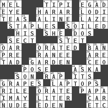 ACROSS 1. Cartoonist voice _ Blanc 4. Native american tent (variation) 8. Mild oath 12. Sight organ 13. Ethiopian city, capital of Harari 14. Farming town in central California 15. Afternoon social gatherings 17. Place in a line 18. Goldbrick 19. Paper fasteners 21. Dirtied 23. Part of HMS, perhaps 24. A female animal or person 26. Two (Sp.) 27. Religious group 28. Proofreading order 30. Boat paddle 31. Declaimed 34. Prohibit 37. Before (prefix) 38. Indian princess (variant) 39. "We ___ not amused" (Victoria) 40. Bit 41. Place where plants grow 42. Corporate head (abbr.) 43. Airs 44. "____ silly question..." 46. Boy, to dad 47. Strike 50. ___ a Wonderful Life 51. Wine fruits 54. Portable computers 57. Cause heat under the collar 58. Declaim 60. Dad 62. "If ____ say so..." 63. 61 cubic inches 64. Automobile 65. Naked 66. Genesis locale 67. And so on (abbr.) DOWN 1. Was introduced to 2. Snake ____ (dice throw) 3. Tough but pliablecoriaceous 4. Stories 5. From or relating to Ireland 6. Baking dish 7. Angers 8. American author Paul (1891-1958) 9. Scores awarded for successful feats 10. Axlike tool, used for shaping wood 11. Passed on 13. Actor Linden 16. Ketch in the Levant 20. Pacific Standard Time (abbr.) 22. Wrote a lyric poem 25. First name in cosmetics 27. "Two Mules for Sister ____" 29. Adolescent 30. Elect 31. Mouths or openings 32. Less widely known 33. Also 34. Keyboard key 35. Length times width 36. Modern: prefix 41. Went 43. Wimpy's pal 44. Small island 45. Constrict 46. Vegetable dish 48. Having winglike extensions 49. Eucharist need 51. Smile widely 52. Tall New Zealand timber tree 53. Flatfish 55. For each 56. Petty quarrel 59. To free from 61. Curve