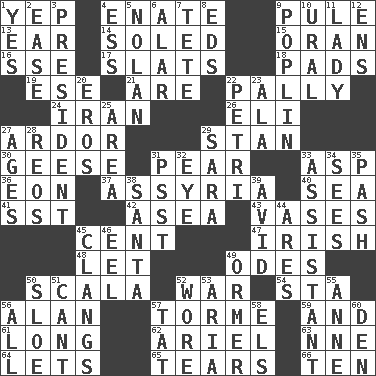 ACROSS 1. Slangy assent 4. Related on the mother's side 9. Whine 13. Hearing organ 14. Having a sole or soles 15. NW Algerian seaport 16. Compass dir. 17. Narrow boards 18. Writing tablets 19. Compass dir. 21. "We ___ not amused" (Victoria) 22. Chummy 24. SW Asia republic 26. Biblical high priest 27. Zeal 29. Comedian Laurel of Laurel & Hardy 30. Honkers 31. Lightbulb-shaped fruit 33. Viper 36. Period of immesurable duration 37. Nineveh was its capital 40. Ocean 41. Fast jet (abbr.) 42. Toward the sea 43. Flower holders 45. Penny 47. From or relating to Ireland 48. Allow 49. Lyric poems 50. Any of the three canals of the cochlea 52. Armed conflict 54. R.R. building 56. Actor Alda or Thicke 57. Singer Mel 59. Plus 61. Protracted 62. Satellite of Uranus 63. Compass dir. 64. Allows 65. Pulls into pieces 66. Nine, plus one DOWN 1. It is so 2. Comfort 3. Elected leader of a country 4. Curvy letter 5. Pitcher Ryan 6. Having or resembling wings 7. Wig 8. Begley and Asner 9. Cotton for raincoats, e.g. 10. Mountain range 11. Kenny Rogers chart-topper in '80 12. Followers of ems 20. Greek god of love 22. _ dish (used to culture cells) 23. Insect wing 25. Type of rug 27. Matures 28. Vintage cars 29. "Two Mules for Sister ____" 31. Inconspicuous attention getter 32. Sight organ 33. Helper 34. Observes 35. Romantic infatuation 38. Before Barbara or Clara 39. Enthusiastic 44. Ancient Greek god of war 45. Rigngs loudly 46. Snakelike fish 49. Abalone 50. A type of plum 51. Patter 52. Had on 53. Roberta Peters solo 55. Queen of England 1702-14 56. 100% 57. Make lace 58. Raised railways 60. Lair