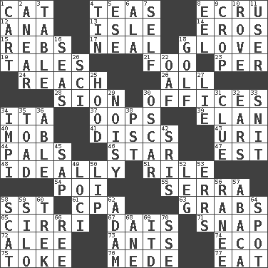ACROSS 1. Domesticated feline 4. Beverages made from leaves 8. Shade of tan 12. Santa ___, CA 13. Small island 14. Greek god of love 15. Confederate soldiers (slang) 17. Anneal 18. Michael Jackson trademark 19. Stories 21. Egg _ yung 23. For each 24. Arrive at 26. 100% 28. The Jewish people; Israel 30. Positions of authority 34. Call ___ day 37. I made a mistake 39. Liveliness 40. Disorderly crowd 41. Plates 43. RI univ. 44. Friends 46. Play the lead 47. Eastern Standard Time (abbr.) 48. Under perfect conditions 51. Cause heat under the collar 54. Luau course 55. Father Junipero _ 58. Fast jet (abbr.) 61. Tax preparer (abbr.) 63. Catches 65. High-altitude cloud 67. Raised platform 71. Fastener 72. Toward shelter 73. Pismires 74. Environmental prefix 75. Puff or smoke 76. Ancient Persian 77. Erode DOWN 1. Draw slowly or heavily 2. Approach 3. Eating place 4. Metal container 5. Compass dir. 6. Insect wing 7. Automatically 8. Snakelike fish 9. Riding implement 10. Be footloose 11. One who makes use of a thing 16. Oceans 18. _ course 20. _-fi 22. Clumsy lout 25. Parka part 27. Falsehood 29. Annoyingly loud 30. Witty Wilde 31. A slight indication 32. Hearing organs 33. In a ____ (agitated or irritated) 34. Body of Kaffir warriors 35. Frog relative 36. Competent 38. Pacific Standard Time (abbr.) 42. Indian titles of respect 45. Plant excrement 49. Venues 50. Mouth edge 52. Part of a journey 53. Blunders 56. The wife of a rajah (variant) 57. Phillipine bananalike plant 58. Scram! 59. Grain storage tower 60. Long journey 62. First of billions? 64. Specific locale 66. Portuguese money of account (variant) 68. One (Scot) 69. It would 70. Compass dir.