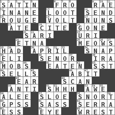 ACROSS 1. Smooth fabric 6. Back 9. Actress Charlotte 12. Empty; void 13. Plunder 14. Post 15. Makeup applied to the cheeks 16. Electrical Unit 17. Religious women 18. Had dinner 19. Quote 20. Went 21. Indian skirt 23. RI univ. 24. Inactive volcano in Sicily 25. Catcalls? 28. Possessed 30. Showery time 34. Fastener 35. Biblical high priest 36. Sir (Sp.) 38. Lyricist Gershwin 39. Disorderly crowds 41. Eroded 43. Fast jet (abbr.) 44. Makes a sale 46. "This won't hurt ____!" 48. Ewer handle 49. Glance over 50. Opposed to 51. Quiet! 53. Deep reverence 56. Toward shelter 57. _ gin 58. Derisive sound 60. Global Positioning Systems (abbr.) 61. Backtalk 62. Spanish missionary in California 63. Curvy letter 64. Sight organ 65. Take or capture by force DOWN 1. Title for a knight 2. Small Philippine buffalo 3. Drawn tight 4. Eat 5. Born 6. Pick up the tab 7. Hero or heavy, e.g. 8. Baseball player Mel 9. One who advocates reunion 10. Queen of England 1702-14 11. Begley and Asner 13. 57 in ancient Rome 14. Sounds asleep 19. Dice game 20. Chewing product 22. Santa ___, CA 24. The property of being fit to eat 26. Armed conflicts 27. Argument over a trivial matter 28. Folds over and sews together 29. _ vera 31. To separate or throw off 32. _ tizzy (2 wds.) 33. Car dealer's back yard 37. Arrive at 40. Chalkboards 42. Basketball assoc. 45. Indian title of respect (Mr.) 47. More empty; more void 49. "______ My Girl" (Turtles hit) 50. High mountains 51. Kill 52. Stockings 54. Had on 55. Blunders 56. Mature 57. Compass dir. 58. Compass dir. 59. Make lace