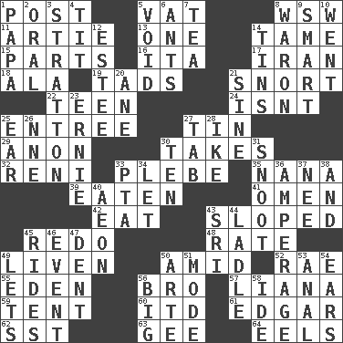 ACROSS 1. Mail 5. Large container 8. Compass dir. 11. Nick name for Arthur 13. Single 14. Not wild 15. Pieces 16. Call ___ day 17. SW Asia republic 18. Insect wing 19. Small amounts or degrees 21. Derisive sound 22. Adolescent 24. Is not 25. Main course 27. Shallow baking pan 29. Soon (poet.) 30. Proceeds 32. Painter Guido (1575-1642) 33. First-year military academy student 35. Nanny 39. Ingested 41. Sign of things to come 42. Ingest 43. Had an oblique or slanted direction 45. Make new 48. Assign a rank or rating to 49. Make or become more lively 50. Among 52. Actress Charlotte 55. Paradise 56. Sis' sibling 57. Climbing, woody, usually tropical vines 59. Portable shelter 60. It would 61. _ Allan Poe 62. Fast jet (abbr.) 63. Unit of force equal to gravity 64. Snakelike fish DOWN 1. Dad 2. Of the mouth 3. Ski resort town in Vermont 4. Teat (slang) 5. Nothingness 6. Pismires 7. Beverage made from leaves 8. Make _____ (do battle with) 9. Don Adams' spy role 10. Gone 12. First name in cosmetics 14. Airtight sealed metal containers 20. A saturated hydrocarbon 21. Trig term 23. Bert's buddy 25. Ewer handle 26. Compass dir. 27. Keyboard key 28. Mamie's husband 30. Nine, plus one 31. Snout, nose 33. Parent Teacher Association (abbr.) 34. Allow 36. Electrical Measurement 37. Born 38. Plus 40. Period of immesurable duration 43. _ Lanka 44. Dipping utensil 45. Amusement-park features 46. Happening 47. Undesirable depression on a surface 49. Allows 50. Johnson of "Laugh-In" 51. Method 53. Of or related to the anus 54. Hearing organs 56. Of large size 58. Binary compound