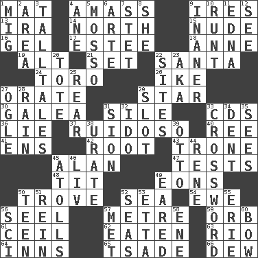ACROSS 1. Floor covering 4. Collect or gather 9. Angers 13. Lyricist Gershwin 14. _ pole 15. Naked 16. Set 17. First name in cosmetics 18. Queen of England 1702-14 19. The first octave above the treble staff 21. Arrange properly for use 22. Before Barbara or Clara 24. "Corrida" creature 26. Mamie's husband 27. Declaim 29. Play the lead 30. An organ shaped like a helmet 31. Filth; sediment 33. Music discs 36. Falsehood 37. Noisy, rowdy, vocal (Spanish) 40. To sift 41. Followers of ems 42. Carrot, for example 43. Heavy duty weighing machine 45. Actor Alda or Thicke 47. Trials 48. Teat (slang) 49. Immeasurably long periods of time 50. Collection of objects 52. Ocean 54. She-sheep 56. Stitch closed the eyes of (a falcon) 57. Distance measurement (Brit.) 59. Globe 61. To provide with a ceiling 62. Consumed 63. River (Sp.) 64. Taverns 65. Sadhe (variant) 66. Morning condensation DOWN 1. Russian fighter aircraft 2. Length times width 3. Baron Munchausen's specialties 4. A saturated hydrocarbon 5. With motion or animation 6. Johnson of "Laugh-In" 7. Proofreading order 8. A female animal or person 9. More lacking in sense or substance 10. The smallest animal of a litter 11. Pulitzer Prize-winning author Ferber 12. Perceive with the eye 20. Haul 22. Locates 23. Alias (abbr.) 25. Tail end 27. Stare at amorously 28. Precipitation 29. Narrow opening 31. The Jewish people; Israel 32. Wedding promise 33. What you're doing now 34. Undesirable depression on a surface 35. Observes 38. A salt of uric acid 39. "Beetle Bailey" pooch 44. French philosopher Descartes 45. Ringlike coral islands and reefs 46. 54 in ancient Rome 49. Having ears or earlike features 50. Adolescent 51. It's straight from the horse's mouth 52. Oceans 53. Singer James 55. One of the Great Lakes 56. _-fi 57. Was introduced to 58. Compass dir. 60. Arrow shooter