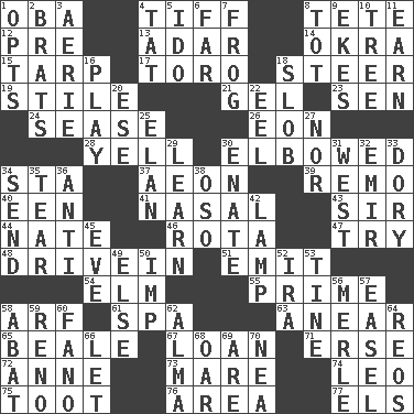 ACROSS 1. Chief or king in Benin or Nigeria 4. Small quarrel 8. False hair 12. Before (prefix) 13. The sixth month of the Jewish calendar 14. Gumbo ingredient 15. Canvas cover 17. "Corrida" creature 18. Bull 19. Vertical member of a panel or frame 21. Set 23. Elected rep. 24. Gospel singer Marvin 26. A really long time 28. Shout 30. Shoved, as through a crowd 34. R.R. building 37. Period of immesurable duration 39. San ____ (Riviera town) 40. Car or cant ending 41. Rhinal 43. Title for a knight 44. Nathan's nickname 46. Round or rotation of duties 47. Attempt to accomplish something 48. Popular '50s hangout 51. Send forth 54. Shade tree 55. First class 58. Sandy's bark 61. Health resort 63. Approach 65. Calif. Air Force Base 67. Grant temporary use of 71. Celtic language 72. Singer Murray 73. Female horse 74. Lion 75. A blast of a horn 76. Length times width 77. Raised railways DOWN 1. Chooses 2. Naughty children 3. Nest on high 4. Make lace 5. Wedding promise 6. Distant 7. Toadlike animal 8. Small child 9. Makes supply last 10. Relationship diagram 11. Merit 16. Shaw product 18. Messy guy 20. Compass dir. 22. Snakelike fish 25. Flair 27. Not either 29. Memorize 30. Maternal 31. Compass direction 32. Independent ruler or chieftain 33. Small, narrow, flatbottom fishing boat 34. Post 35. Lacerate 36. Against 38. Bear (Spanish) 42. Desk light 45. First lady 49. Otherwise 50. Mischievous child 52. Retirement account (abbr.) 53. Prong on a fork 56. Haggard of country music 57. Artist's stand 58. Blind as ____ 59. Western Nevada city 60. Papal veil 62. _ mater 64. Vintage cars 66. Allow 68. Rowing implement 69. "We ___ not amused" (Victoria) 70. Teachers' org.