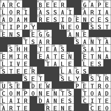 ACROSS 1. Curve 4. Fermented drink made from hops 8. Stare wonderingly 12. Australian parrot (variant) 14. Slender Brazilian palm 16. Operatic vocal solo 17. First man 18. Homes 20. Likely to tip or tilt 22. Modern: prefix 23. Fast jet (abbr.) 24. Followers of ems 25. Ovum 28. A saturated hydrocarbon 30. Russian ruler of old 31. Before Barbara or Clara 35. Quiet! 37. Beverages made from leaves 40. Move on water 41. Independent ruler or chieftain 42. Consumed 44. Inactive volcano in Sicily 45. Moving, as bait 46. Story 47. French article 48. Guide 50. Fails to keep up a pace 52. Arrange properly for use 54. Stealthy 55. Title for a knight 58. Purpose 61. Morning condensation 63. Stone: prefix 65. Parts 70. Frog relative 71. Den 72. Natives or inhabitants of Denmark 73. Quote 74. Johnson of "Laugh-In" 75. French philosopher Descartes 76. Corporate head (abbr.) DOWN 1. Having winglike extensions 2. "The Thinker" sculptor 3. Dice game 4. Drinking establishment 5. Compass dir. 6. Double-curved letter 7. Water falling in drops from the sky 8. Separate the seeds from cotton 9. Arches 10. Sliced desserts 11. Compass direction 13. Mischievous child 15. It may be bright or harebrained 19. Immeasurably long periods of time 21. Consenting reply 26. Yard entry 27. Relatively large 29. Artist's stands 30. Triads 32. Nathan's nickname 33. Canisters 34. Insect wing 35. Stricken, poetically 36. Hub of activity 38. "One Day ___ Time" 39. Makes a sale 41. Raised railways 43. Anneal 49. Redecorate 51. Hustle 53. Watch over 55. Unemotional 56. Feeling or showing extreme anger 57. Cowboy competition 58. Southern CA. univ. 59. Fly high 60. Give off 62. Erode 64. And so on (abbr.) 66. Before (prefix) 67. Compass dir. 68. Nine, plus one 69. Compass dir.