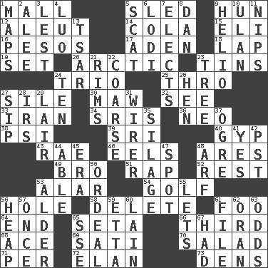 ACROSS 1. Shopping center 5. Downhill vehicle 9. Attila the _ 12. Eskimo relative 14. Root beer relative 15. Connecticut Ivy Leaguer 16. Mexican monetary units 17. An important port of Yemen 18. Infant locale 19. Arrange properly for use 20. Northern region 23. Airtight sealed metal containers 24. Musical group of three 25. Through, poetically 27. Filth; sediment 30. Informal term for the mouth 32. Perceive with the eye 33. SW Asia republic 34. Indian titles of respect 36. Modern: prefix 38. Air pressure measure (abbr.) 39. _ Lanka 40. Swindle 43. Actress Charlotte 46. Snakelike fish 48. Ancient Greek god of war 49. Sis' sibling 51. Reproach for some lapse or misdeed 52. State of inaction 53. Having or resembling wings 54. Eighteen holes 56. Opening into or through something 58. Keyboard key 61. Egg _ yung 64. Conclude 65. Bristle 66. One of three equal parts 68. Adept person 69. Suttee (variant) 70. First course 71. For each 72. Enthusiasm 73. Hiding places for outlaws DOWN 1. Atlas contents 2. Toward shelter 3. For fear that 4. Nilotic language 5. Jazz singing style 6. Farming town in central California 7. Opts 8. Daniel's nick name 9. Sun: prefix 10. ____ Bator, Mongolia 11. Cuts off 13. Russian ruler of old 21. Basketball hoops 22. Unrefined 23. Family _ (genealogy) 24. "___ Little Indians" 26. Layer 27. Small drink 28. Big collection agency 29. Den 31. One who wires 35. Fodder prepared in a silo 37. Legendary monster 41. Consenting reply 42. Pacific Standard Time (abbr.) 44. Competent 45. Period 47. Blemish 48. Sandy's bark 50. Severe or trying experience 53. Tree or shrub in the Birch family 55. Allows 56. Pile 57. At one time in the past 59. Singer James 60. (Had) reclined 61. Do some clerical work 62. NW Algerian seaport 63. Likelihood 65. Compass dir. 67. Possessed
