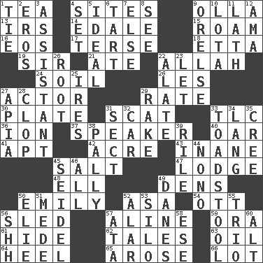 ACROSS 1. Beverage made from leaves 4. Settings 9. Rounded earthenware pot or jar 13. Big collection agency 14. Peak District village in England 15. Wander aimlessly 16. Greek goddess of the dawn 17. Laconic 18. Singer James 19. Title for a knight 21. Had dinner 22. Assad's deity 24. Land 26. French article 27. Thespian 29. Assign a rank or rating to 30. Food holder 31. Jazz singing style 33. Affectionate concern, for short 36. Electrically charged atom 37. Orator 40. Rowing implement 41. Fitting 42. Land measure 43. Empty; void 45. Table seasoning 47. Cabin 48. Pipe bend 49. Hiding places for outlaws 50. Poet Dickinson 52. White ___ sheet 54. Baseball player Mel 56. Downhill vehicle 57. Place in a line 59. Mouth or opening 61. Flintstone garb 62. Stories 63. Lubricate 64. Person who is morally reprehensible 65. Came up 66. Car dealer's back yard DOWN 1. Standoff 2. Greek god of love 3. Helper 4. Put into a specified state 5. Perfect 6. Small pie 7. Otherwise 8. Observe 9. Threatening words 10. Globular water bottle used in Asia 11. Thin strip of wood or metal 12. Wet nurse (var.) 20. Carrot, for example 22. Having winglike extensions 23. Allow 25. Angers 27. Capital of Western Samoa 28. Hoof sound 29. Libertine 31. Religious group 32. Automobile 33. Inedible or poisonous agaric 34. Austrian-born American filmmaker Fritz 35. Algonquian 38. Chummy 39. Cause heat under the collar 44. Words to Nanette 45. A glass for beer 46. Everything 49. Natives or inhabitants of Denmark 50. Writer Wiesel 51. Ancient Persian 52. Having or resembling wings 53. Grain storage tower 55. Musical group of three 56. Quiet! 57. _ moment's notice (2 wds.) 58. Compass dir. 60. Keyboard modifier key