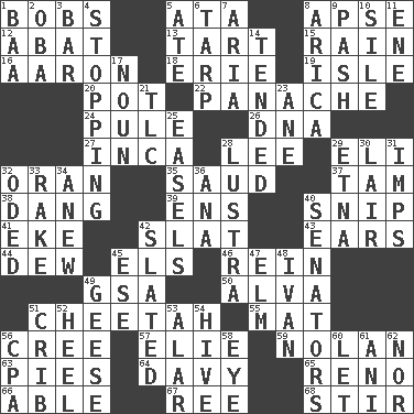 ACROSS 1. Moves up and down 5. _ moment's notice (2 wds.) 8. Domed church section 12. Blind as ____ 13. Small pie 15. Precipitation 16. Composer Copland 18. One of the Great Lakes 19. Small island 20. Cooking vessel 22. Flamboyance 24. Whine 26. Heredity factor (abbr.) 27. South American Indian 28. Area sheltered from the wind 29. Connecticut Ivy Leaguer 32. Northwest Algerian city 35. Saudi Arabian king (1953-1964) 37. Scottish cap 38. Mild oath, euphamism for damn 39. Followers of ems 40. Sever or remove by pinching or nipping 41. Make supply last 42. Narrow board 43. Hearing organs 44. Morning condensation 45. Raised railways 46. It's straight from the horse's mouth 49. Girls' org. (abbr.) 50. Inventor's middle name 51. Leopard's kin 55. Floor protector 56. Algonquian 57. Writer Wiesel 59. Pitcher Ryan 63. Sliced desserts 64. _ Jones' Locker 65. Former U.S. Attorney General Janet 66. Competent 67. Portuguese money of account (variant) 68. Use a swizzle stick DOWN 1. Sound made by sheep 2. Chief or king in Benin or Nigeria 3. Long, evenly shaped piece 4. Ceasing 5. Had dinner 6. Canvas cover 7. Roberta Peters solo 8. N. Chile seaport 9. Romantic infatuation 10. Drop; flow; fall 11. Compass dir. 14. Looked after 17. Part of speech 21. Affectionate concern, for short 23. One (Scot) 25. Artist's stands 28. A period of five years 29. Inactive volcano in Sicily 30. Den 31. Naughty children 32. Wrote a lyric poem 33. Libertine 34. Afresh 36. Santa ___, CA 40. Elected representatives 42. Scheduled 45. Compass dir. 47. Shade tree 48. "Terrible" tsar 49. Honkers 51. Baby bed with high sides 52. The bottom of a shoe or boot 53. Having or resembling wings 54. Hub of activity 56. Tax preparer (abbr.) 58. Sight organ 60. Allow 61. Cuckoo 62. Not either