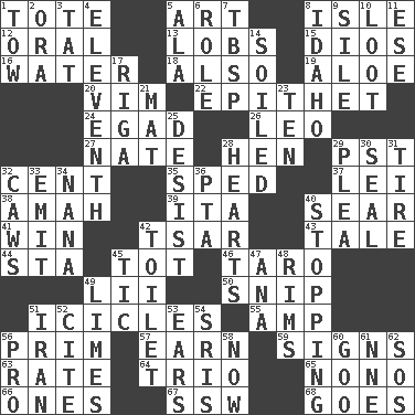 ACROSS 1. Carry 5. Tate display 8. Small island 12. Relating to the mouth 13. Tennis shots 15. "Vaya con ____" 16. Wetness 18. In addition 19. _ vera 20. Zeal 22. Curse 24. Mild oath 26. Lion 27. Nathan's nickname 28. Layer 29. Pacific Standard Time (abbr.) 32. Penny 35. Broke a traffic law 37. Luau accessory 38. Nanny 39. Call ___ day 40. Burn superficially 41. Acquire through effort 42. Russian ruler of old 43. Lie 44. R.R. building 45. Small child 46. Pacific island yam 49. Cards in a Roman deck? 50. Sever or remove by pinching or nipping 51. Winter's stalactites 55. Electrical Unit 56. Demure 57. Merit 59. Signals 63. Pace 64. Musical group of three 65. Words to Nanette 66. Singles 67. Compass dir. 68. Travels DOWN 1. Pull behind 2. Mouth or opening 3. Make lace 4. Veterans Day date 5. Chicken ___ king 6. Hero or heavy, e.g. 7. Cook's measure (abbr.) 8. Potato state 9. Filth; sediment 10. Plunder 11. Compass dir. 14. Dirtied 17. Capital of Latvia 21. Floor protector 23. "___ Little Indians" 25. Stop 28. Centers 29. Entreaty 30. Lick closed 31. Hoop that covers a wheel 32. Crow sounds 33. Give off 34. Grandmother 36. Parent Teacher Association (abbr.) 40. Obstructing or blocking passage 42. Bathroom 45. Nervous spasm 47. Santa ___, CA 48. Basketball hoops 49. Citrus fruits 51. SW Asia republic 52. Quote 53. Hearing organs 54. Indian titles of respect 56. Adept person 58. Immediately 60. Thick or sticky substance 61. Compass dir. 62. Distress signal