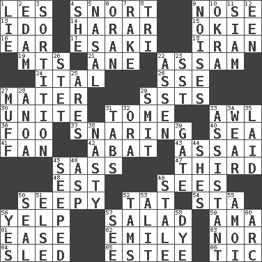 ACROSS 1. French article 4. Derisive sound 9. Olfactory organ 13. Wedding promise 14. Ethiopian city, capital of Harari 15. Migrant worker of the '30s 16. Hearing organ 17. 1973 Nobel Price Winner (Physics) Leo 18. SW Asia republic 19. Mountains (abbr.) 21. One (Scot) 22. Indian state 24. Slanted text style (abbr.) 26. Compass dir. 27. Mother 29. Fast planes 30. Join together 31. Heavy book 33. Leather borer 36. Egg _ yung 37. Catching in a trap 40. Ocean 41. Air blower 42. Blind as ____ 43. Slender Brazilian palm 45. Backtalk 47. One of three equal parts 48. Eastern Standard Time (abbr.) 49. Observes 50. Not well drained, as in land 52. Make lace 54. R.R. building 56. Sharp bark 57. First course 59. Housemaid (var.) 61. Relaxation 62. Poet Dickinson 63. Not either 64. Downhill vehicle 65. First name in cosmetics 66. Nervous spasm DOWN 1. Whopper 2. Dutch treat 3. Making a chance decision by using lots 4. A female animal or person 5. Rhinal 6. Northwest Algerian city 7. Immoral or dissolute person 8. Three (prefix) 9. Annoying sounds 10. Gumbo ingredient 11. Thailand, formerly 12. Car or cant ending 20. Proofreading order 22. NE Netherlands city 23. Fast jet (abbr.) 25. Ancient Greek god of war 27. Bungle 28. Small Philippine buffalo 29. Stricken, poetically 31. Bar bills 32. Mouth or opening 33. Aide 34. Erode 35. Put down 38. Characterized by obscenity 39. Yard entry 44. "______ My Girl" (Turtles hit) 45. Oozed 46. Cleo's killer 49. Lacking originality or spontaneity 50. Lick closed 51. Otherwise 52. Scottish caps 53. Set down 55. Mine, in Marseilles 56. Consenting reply 57. Observe 58. Color 60. Curve