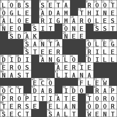 ACROSS 1. Tennis shots 5. Stalk of a moss capsule 9. Carrot, for example 13. Stare 14. First of billions? 15. One or ones belonging to thee 16. Medicinal plant 17. Complicated, petty procedures 19. Modern: prefix 20. Be seated 21. Single 22. Fast jet (abbr.) 23. Neighbor of Neb. 25. Born 26. Before Barbara or Clara 30. Cassini of fashion 34. Bull 35. Cause heat under the collar 36. "You Light Up My Life" star Conn 39. White American of non-Hispanic descent 42. Deli pickle 43. Greek god of love 44. Nest on high 46. Political cartoonist Thomas 47. Woody, climbing, usually tropical plant 48. Environmental prefix 51. Soared 54. Sep. follower 57. Apply (a substance) by light strokes 58. Wedding promise 60. Hit sharply and swiftly 62. Appease 65. "Corrida" creature 66. Laconic 67. Enthusiasm 68. Aroma 69. Religious group 70. Table seasoning 71. Left DOWN 1. Grant temporary use of 2. Stares 3. Vital fluid 4. Perceive with the eye 5. Indian skirt 6. Prepare for publication 7. Label 8. ID or VA city 9. 17th letter of the Greek alphabet 10. Lubricates 11. Washington bills 12. Trial 15. Family _ (genealogy) 18. A saturated hydrocarbon 20. Three-handed card game 24. Aid 27. Teachers' org. 28. "___ Little Indians" 29. Therefore, facetiously 30. Severe or trying experience 31. Cards in a Roman deck? 32. Pipe bend 33. Set 36. Lair 37. Retirement account (abbr.) 38. Two (Sp.) 40. Flowery wreath 41. Mouth or opening 45. A message received and understood 48. Singer Brickell 49. Feline 50. Off-Broadway awards 52. Eat (away) 53. Make _____ (do battle with) 54. Elects 55. Algonquian 56. Torque (variant) 58. Slanted text style (abbr.) 59. Gouge 61. Left side of a ship or aircraft 63. Pacific Standard Time (abbr.) 64. Chicken ___ king 65. Pull behind