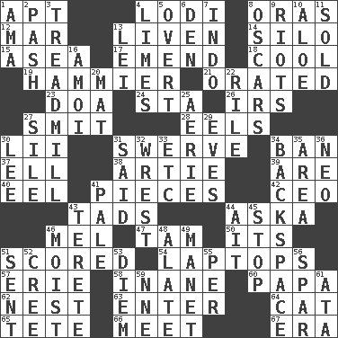 ACROSS 1. Fitting 4. Farming town in central California 8. Mouths or openings 12. Impair 13. Make or become more lively 14. Grain storage tower 15. Toward the sea 17. Make improvements or corrections to 18. Calm and collected 19. More overdramatic by comparison 21. Spoke pompously 23. ___ good deed 24. R.R. building 26. Big collection agency 27. Stricken, poetically 28. Snakelike fish 30. Cards in a Roman deck? 31. Turn aside suddenly 34. Bar 37. Pipe bend 38. Nick name for Arthur 39. "We ___ not amused" (Victoria) 40. Snakelike fish 41. Components 42. Corporate head (abbr.) 43. Bits 44. "____ silly question..." 46. Cartoonist voice _ Blanc 47. Scottish cap 50. It is 51. Tallied 54. Portable computers 57. One of the Great Lakes 58. Empty; void 60. Dad 62. Egg locale 63. Keyboard key 64. Domesticated feline 65. False hair 66. Rendezvous 67. Period DOWN 1. Housemaid (var.) 2. Romantic infatuation 3. Excercise machine 4. Citrus fruits 5. Unconcealed 6. Lair 7. Southeast Asian peninsula 8. Motion picture awards 9. Disturbances 10. Medicinal plant 11. Exchanged or delivered for money 13. Flowery wreath 16. Mine, in Marseilles 20. Floor covering 22. Cause heat under the collar 25. Nest on high 27. Filth; sediment 29. Nights before holidays 30. Area sheltered from the wind 31. Expressed in words 32. Take or capture by force 33. And so on (abbr.) 34. Keyboard key 35. Type of rug 36. Modern: prefix 41. Light colored 43. Cylindrical with tapered ends 44. Small island 45. Constrict 46. Wet 48. Having winglike extensions 49. French painter Edouard 51. Posted 52. Algonquian 53. South Vietnam president (1954) 55. For each 56. Coast Guard woman 59. Compass dir. 61. "One Day ___ Time"