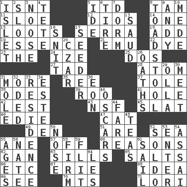 ACROSS 1. Is not 5. It would 8. Scottish cap 11. A type of plum 12. "Vaya con ____" 14. Single 15. Plunders 17. Spanish missionary in California 18. Find the sum of 19. Substance 21. Australian flightless bird 22. Color 23. Definite Article 24. Ending with capital 25. Two (Sp.) 27. Bit 28. Smallest unit of an element 31. Greater amount 35. To riddle 37. Lacquered or enameled metalware 38. Lyric poems 39. Friend of Pooh 41. Hollow 42. For fear that 43. Overdraft (abbr.) 45. Narrow board 46. Singer Brickell 47. Domesticated feline 49. Lair 51. "We ___ not amused" (Victoria) 52. Ocean 55. A saturated hydrocarbon 57. Not in operation 60. Thinks logically 62. Separate the seeds from cotton 63. Beverly of Met fame 65. Table seasonings 66. And so on (abbr.) 67. 4th largest of the Great Lakes 68. The content of cognition 69. Observe 70. Mountains (abbr.) 71. Australian parrot (variant) DOWN 1. Small island 2. Make a splashing sound 3. Trap for birds or small mammals 4. Wig 5. Binary compound 6. Hoop that covers a wheel 7. Dormintory (informal) 8. Inedible or poisonous agaric 9. "60 Minutes" Commentator Rooney 10. Ancient Persian 13. Saudi Arabian king (1953-1964) 16. In a ____ (agitated or irritated) 17. Sowing specialist 20. Russian ruler of old 26. Profane or obscene expressions 29. Rounded earthenware pot or jar 30. Confront 31. Undercover agent 32. Wrote a lyric poem 33. Dwelling 34. First name in cosmetics 36. A really long time 40. Motion picture awards 44. Conductor's collection 48. Afternoon social gatherings 50. Characteristic smell of wine 52. Twentieth part of a lira 53. Keyboard key 54. Slender Brazilian palm 55. Eons 56. Nathan's nickname 58. Unshakable 59. Sudden quick movement 61. Move on water 64. French article