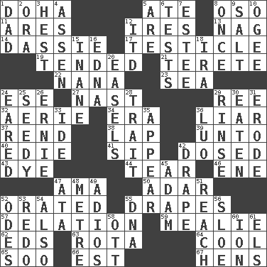 ACROSS 1. Capital of the state of Qatar 5. Had dinner 8. Bear (Spanish) 11. Ancient Greek god of war 12. Angers 13. Tired old horse 14. Hyrax 17. A testis 19. Watched over 21. Cigar-shaped 22. Grandmother 23. Ocean 24. Compass dir. 27. Political cartoonist Thomas 29. To sift 32. Nest on high 34. Epoch 36. One who doesn't tell the truth 37. Tear apart 38. Pet locale 39. To (old English) 40. Singer Brickell 41. Small drink 42. Administered medicine 43. Color 44. Lacerate 46. Compass dir. 47. Nursemaid (var.) 50. The sixth month of the Jewish calendar 52. Spoke pompously 55. Window treatments 57. Accusation by an informer 59. Ear of corn 62. Begley and Asner 63. Round or rotation of duties 64. Calm and collected 65. "Barney Miller" actor Jack 66. Eastern Standard Time (abbr.) 67. Coop moms DOWN 1. June honoree 2. Mouth or opening 3. Behest 4. NE Netherlands city 5. "We ___ not amused" (Victoria) 6. Trials 7. First name in cosmetics 8. Single time 9. Table seasoning 10. Double curve, resembling the letter S 12. It would 15. Empty; void 16. Pulitzer Prize-winning author Ferber 18. Lyricist Gershwin 20. Artist's stands 24. Having ears or earlike features 25. Morally degraded 26. Bert's buddy 28. Distinguishing feature 29. Remove soap 30. Consumed 31. Wear away 33. Binary compound 35. Become visible 36. Nilotic language 42. Window treatment 45. First of billions? 47. _ moment's notice (2 wds.) 48. Distance measurement (Brit.) 49. Goodbye (Sp.) 51. Arrive at 52. Lyric poems 53. Do over again 54. In addition 55. Heredity factor (abbr.) 56. A type of plum 58. Baseball player Mel 60. Electrically charged atom 61. Raised railways