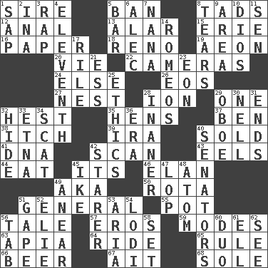 ACROSS 1. Title for a man of rank and authority 5. Prohibit 8. Small amounts or degrees 12. Of or related to the anus 13. Having or resembling wings 15. 4th largest of the Great Lakes 16. Some stationery 18. Former U.S. Attorney General Janet 19. A really long time 20. Compete 22. Devices for capturing images 24. Otherwise 26. Greek goddess of the dawn 27. A home for chicks 28. Electrically charged atom 29. Single 32. Command 35. Coop moms 37. Benjamin's nick name 38. Hankering 39. Lyricist Gershwin 40. Exchanged or delivered for money 41. Heredity factor (abbr.) 42. Examine hastily 43. Snakelike fish 44. Ingest 45. ___ a Wonderful Life 46. Flair 49. Alias (abbr.) 50. Roll call or roster of names 51. Commissioned military rank 55. Plant holder 56. Falsehood 57. Greek god of love 59. Methods 63. Capital of Western Samoa 64. Travel on or in a vehicle 65. Court order 66. Fermented drink made from hops 67. Small island 68. Not divided or shared with others DOWN 1. Plant excrement 2. _ tizzy (2 wds.) 3. Reproach for some lapse or misdeed 4. Veterans Day date 5. Oblong piece of solid material 6. Actor Baldwin 7. Grandmother 8. Lacerates 9. Type of rug 10. "Vaya con ____" 11. Elected rep. 14. Lover boys 17. Cause heat under the collar 21. Curvy letter 23. A really long time 25. Value system 28. Sillier 29. Mitch Miller's instrument 30. 1994 drama film starring Jodie Foster 31. Conclusions 32. Flintstone garb 33. Inactive volcano in Sicily 34. Get outta here! 36. Period 40. Elected representatives 42. A viewer who gazes fixedly 45. Mamie's mate 47. Chop off 48. Tiny particle 49. Approach 51. Stare wonderingly 52. Writer Wiesel 53. Roberta Peters solo 54. Farming town in central California 56. Bar bill 58. Arrange properly for use 60. Superhero pair 61. Pipe bend 62. Observe