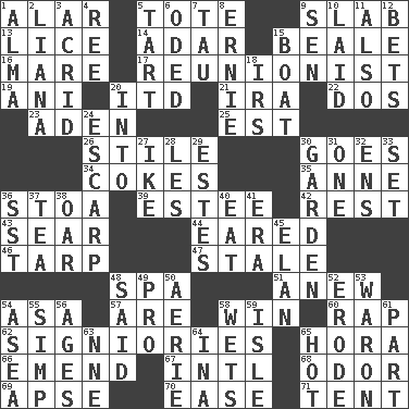 ACROSS 1. Having or resembling wings 5. Haul 9. Thick slice 13. Louse (plural) 14. The sixth month of the Jewish calendar 15. Memphis, Tenn. Street 16. Female horse 17. One who advocates reunion 19. Black tropical American cuckoo 20. It would 21. Retirement account (abbr.) 22. Two (Sp.) 23. Arabian gulf 25. Eastern Standard Time (abbr.) 26. Vertical member of a panel or frame 30. Leaves 34. Popular sodas 35. Queen of England 1702-14 36. Portico 39. First name in cosmetics 42. Relief 43. Burn superficially 44. Having ears or earlike features 46. Canvas cover 47. Lacking originality or spontaneity 48. Health resort 51. Afresh 54. White ___ sheet 57. "We ___ not amused" (Victoria) 58. Acquire through effort 60. Strike 62. Seigniories (variant) 65. Israeli folk dance 66. Make improvements or corrections to 67. International (abbr.) 68. Aroma 69. Domed church section 70. Comfort 71. Portable shelter DOWN 1. _ mater 2. Woody, climbing, usually tropical plant 3. Sour-tasting 4. To separate or throw off 5. Small pie 6. Wrote a lyric poem 7. The 19th letter of the Greek alphabet 8. Bert's buddy 9. Elected rep. 10. Put down 11. In addition 12. Antes 15. Water vessel 18. Big collection agency 20. To the inside or interior of 24. Fortification 27. D.D.E's nickname 28. French article 29. _____ Park, CO 30. Place where plants grow 31. Single 32. Followers of ems 33. Arrange properly for use 36. Fast jet (abbr.) 37. Afternoon social gathering 38. Rowing implement 40. Erode 41. Epoch 45. Style 48. Stated 49. Adept person 50. Nest on high 52. Wear away 53. Make _____ (do battle with) 54. At sea 55. Simple or foolish person 56. Matures 58. Moistens 59. Small island 61. Component 63. Compass dir. 64. _ tizzy (2 wds.) 65. Being at a high temperature