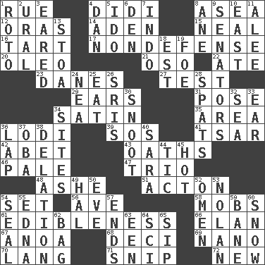 ACROSS 1. Sorrow 4. "You Light Up My Life" star Conn 8. At sea 12. Mouths or openings 14. Arabian gulf 15. Anneal 16. Small pie 17. Unrelated to defense, as in spending 20. Margarine 21. Bear (Spanish) 22. Had dinner 23. Natives or inhabitants of Denmark 27. Trial 29. Hearing organs 31. Airs 34. Smooth fabric 35. Length times width 36. Farming town in central California 39. Distress signal 41. Russian ruler of old 42. Collude with 43. Expletives 46. Light colored 47. Musical group of three 48. American tennis player Robert 51. NE Massachussets city 54. Put into a specified state 56. "___ Maria" 58. Disorderly crowds 61. The property of being fit to eat 66. Enthusiasm 67. Small Philippine buffalo 68. Tenth: prefix 69. Billionth: prefix 70. Long (Scottish) 71. Clip 72. ___ Haven, CT DOWN 1. Printing process, for short 2. Mountain range 3. Having ears or earlike features 4. One of the 12 tribes of Israel 5. Wedding promise 6. Lair 7. _ china 8. A saturated hydrocarbon 9. Elected representatives 10. 90 degrees 11. Toward shelter 13. Portico 18. Eastern Standard Time (abbr.) 19. Enemy 24. Teachers' org. 25. Erode 26. Indian titles of respect 28. Arguments over trivial matters 30. Snob 32. Ocean 33. Hearing organ 34. Locates 36. Infant locale 37. Chief or king in Benin or Nigeria 38. Conveyance 40. "Two Mules for Sister ____" 44. Nervous spasm 45. Being at a high temperature 49. Actor Linden 50. Night before a holiday 52. Sign of things to come 53. Pitcher Ryan 54. Lick closed 55. Pulitzer Prize-winning author Ferber 57. Conclusions 59. Object of repulsion 60. Overwhelm 62. Container for groceries 63. Car or cant ending 64. _-fi 65. Small drink