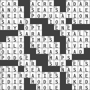 ACROSS 1. Auto 4. Measure of real estate 8. The sixth month of the Jewish calendar 12. Small Philippine buffalo 14. Theater features 16. Diluted with white 17. Famous astronaut Armstrong 18. Census information 20. Vegetable dish 22. Electrically charged atom 23. Arrange properly for use 24. Attempt to accomplish something 25. Elect 28. Compass dir. 30. "Two Mules for Sister ____" 31. Honor 35. Fast jet (abbr.) 37. Naughty children 40. Having or resembling wings 41. _ and Stitch 42. Haggard of country music 44. 57 in ancient Rome 45. Margarine 46. Oceans 47. Bit 48. Porridge 50. Atlas contents 52. Ewer handle 54. Institute legal proceedings 55. Raised railways 58. Part of HMS, perhaps 61. Ocean 63. Rhinal 65. Pleas 70. Immoral or dissolute person 71. Singer Brickell 72. Methods 73. Supplemented with great effort 74. Old wives' tales, e.g. 75. Undercover agent 76. Big collection agency DOWN 1. 2nd pers. sing. pres. of can (arch.) 2. Approach 3. Turbulent 4. Cleo's killer 5. Corporate head (abbr.) 6. Reproach for some lapse or misdeed 7. Needle case 8. Fitting 9. Raised platform 10. Medicinal plant 11. Monthly bill 13. Insect wing 15. _ gin 19. Queen of England 1702-14 21. ___ good deed 26. Demure 27. Makes less strong or intense 29. Glorifies 30. Moe Howard, for one 32. Inventor's middle name 33. Put down 34. Three (prefix) 35. Grain storage tower 36. Downhill vehicle 38. Before (prefix) 39. Hits or strikes with great force 41. Chop off 43. He sold his birthright 49. Comfort 51. Animal enclosure 53. 480, 500 or 516 sheets of paper 55. 1973 Nobel Price Winner (Physics) Leo 56. Member of a famous L.A. basketball team 57. Bobsleighs 58. The bottom of a shoe or boot 59. _ china 60. Agitate 62. Tiny particle 64. "We ___ not amused" (Victoria) 66. To sift 67. Wedding promise 68. Snakelike fish 69. Compass dir.