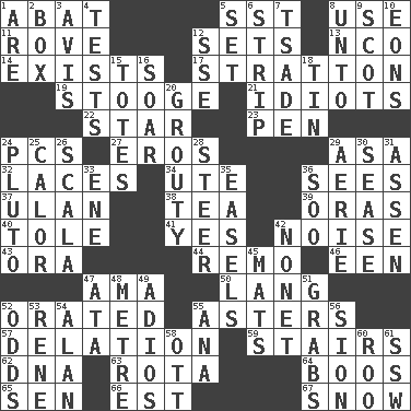 ACROSS 1. Blind as ____ 5. Fast jet (abbr.) 8. Purpose 11. Be footloose 12. Arranges properly for use 13. Non-commissioned officer (abbr.) 14. Has an existence 17. Ski resort town in Vermont 19. Moe Howard, for one 21. Foolish or stupid persons 22. Play the lead 23. Fenced enclosure 24. Personal Computers (abbr.) 27. Greek god of love 29. White ___ sheet 32. Shoestrings 34. Shoshoni 36. Observes 37. Uhlan (variant) 38. Beverage made from leaves 39. Mouths or openings 40. Lacquered or enameled metalware 41. Affirmative reply 42. Annoying sound 43. Mouth or opening 44. San ____ (Riviera town) 46. Car or cant ending 47. Housemaid (var.) 50. Austrian-born American filmmaker Fritz 52. Declaimed 55. Michaelmas daisies 57. Accusation by an informer 59. Flight of steps 62. Heredity factor (abbr.) 63. Round or rotation of duties 64. Scornful sounds 65. Elected rep. 66. Eastern Standard Time (abbr.) 67. Frozen precipitation DOWN 1. "We ___ not amused" (Victoria) 2. Gift holder 3. Advice 4. Trials 5. Arrange properly for use 6. Empty completely 7. Sadhe (variant) 8. To (old English) 9. Highlander 10. Immeasurably long periods of time 12. Compass dir. 15. Lugs 16. Fly high 18. Metal container 20. Sullen 24. Cartoon dog 25. Bodily heat indicating an inflammation 26. Any of the three canals of the cochlea 28. Bull 29. Nest on high 30. Gospel singer Marvin 31. NE Netherlands city 33. Compass dir. 35. Artist's stands 36. "Barney Miller" actor Jack 42. Music written for nine 45. Floor coverings 47. "One Day ___ Time" 48. Distance measurement (Brit.) 49. Goodbye (Sp.) 51. Takes hold of 52. Probability 53. French philosopher Descartes 54. Actor Alda or Thicke 55. Santa ___, CA 56. The Jewish people; Israel 58. Baseball player Mel 60. Friend of Pooh 61. Compass dir.