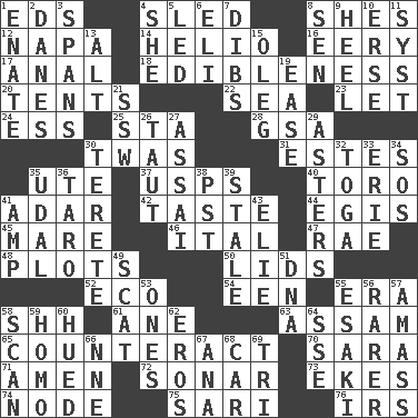 ACROSS 1. Begley and Asner 4. Downhill vehicle 8. "______ My Girl" (Turtles hit) 12. California wine valley 14. Sun: prefix 16. Suggestive of the supernatural 17. Of or related to the anus 18. The property of being fit to eat 20. Portable shelters 22. Ocean 23. Allow 24. Double-curved letter 25. R.R. building 28. Girls' org. (abbr.) 30. It was, poetically 31. _____ Park, CO 35. Shoshoni 37. United States Postal Service (abbr.) 40. "Corrida" creature 41. The sixth month of the Jewish calendar 42. Clothes sense 44. Armor plate that protects the chest 45. Female horse 46. Slanted text style (abbr.) 47. Actress Charlotte 48. Secret plans 50. Flaplike coverings 52. Environmental prefix 54. Car or cant ending 55. Period 58. Quiet! 61. One (Scot) 63. Indian state 65. Neutralize 70. "Two Mules for Sister ____" 71. So be it 72. Underwater navigation system 73. Makes supply last 74. Thickened enlargement 75. Indian skirt 76. Big collection agency DOWN 1. Related on the mother's side 2. Natives or inhabitants of Denmark 3. Connects, as a bridge 4. A female animal or person 5. Directed 6. Biblical high priest 7. Claim 8. Elected rep. 9. Person who is morally reprehensible 10. Celtic language 11. System (abbr.) 13. The first octave above the treble staff 15. Cassini of fashion 19. Comfort 21. Compass dir. 26. Drawn tight 27. Slender Brazilian palm 29. Michaelmas daisies 30. Cylindrical with tapered ends 32. Ancient Roman robe 33. One of the Great Lakes 34. Distress signal 35. Freehold land 36. Edible starchy tuberous root 38. Pacific Standard Time (abbr.) 39. Having lost freshness 41. Electrical Unit 43. Writer Wiesel 49. Jazz singing style 51. Heredity factor (abbr.) 53. Washington bills 55. 1973 Nobel Price Winner (Physics) Leo 56. More uncommon 57. Collect or gather 58. Examine hastily 59. Like (prefix) 60. Took on color 62. Greek god of love 64. Compass dir. 66. Compass dir. 67. Santa ___, CA 68. 4-wheeled motor vehicle 69. Three (prefix)