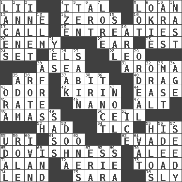 ACROSS 1. Cards in a Roman deck? 4. Slanted text style (abbr.) 8. Grant temporary use of 12. Queen of England 1702-14 14. Nothings 16. Gumbo ingredient 17. Give a ring to 18. Pleas 20. Foe 22. Hearing organ 23. Eastern Standard Time (abbr.) 24. Arrange properly for use 25. Raised railways 28. Lion 30. At sea 31. Odor 35. Sandy's bark 37. "This won't hurt ____!" 40. To trail on the ground 41. Scent 42. Japanese brewing company 44. Comfort 45. Assign a rank or rating to 46. Billionth: prefix 47. Keyboard modifier key 48. Collect or gather 50. To provide with a ceiling 52. Possessed 54. Affectionate concern, for short 55. Part of HMS, perhaps 58. RI univ. 61. "Barney Miller" actor Jack 63. Elude 65. Innocence, gentleness, or tenderness 70. Toward shelter 71. Actor Alda or Thicke 72. Nest on high 73. Frog relative 74. Grant temporary use of 75. "Two Mules for Sister ____" 76. Cunning DOWN 1. Shoestrings 2. Lacking in sense or substance 3. An arm off of a larger body of water 4. Ending with capital 5. "___ Little Indians" 6. Nonscientific branch of learning 7. Old wives' tales, e.g. 8. Car dealer's back yard 9. Migrant worker of the '30s 10. Ancient Greek god of war 11. Political cartoonist Thomas 13. Shade tree 15. Lick closed 19. Length times width 21. It is so 26. Path through which fluid escapes 27. Unit of acoustic absorption 29. Severe or trying experience 30. Anew 32. Of the mouth 33. Vertical spar for supporting sails 34. Personal question 35. First of billions? 36. Roll call or roster of names 38. Lyricist Gershwin 39. A color or tint 41. Mouth or opening 43. Christmas carol 49. Backtalk 51. Frozen water 53. Capital of the state of Qatar 55. Rings 56. Standard of perfection 57. Full of seeds 58. Hereditary estate 59. Hero or heavy, e.g. 60. "Terrible" tsar 62. Washington bills 64. Large container 66. Working for oneself (abbr.) 67. Period 68. Title for a knight 69. Ocean