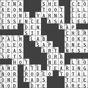 ACROSS 1. Inactive volcano in Sicily 5. A female animal or person 8. Corporate head (abbr.) 11. Period of immesurable duration 12. A blast of a horn 14. Pipe bend 15. Marketplace scale 17. Entertaining tales 18. Whopper 19. Center 21. White ___ sheet 22. Part of a journey 23. Born 24. Lair 25. Hit sharply and swiftly 27. Be seated 28. "Mermaids" star 31. Inside of hand 35. Experiment locale 37. Casino tip 38. Butter sub 39. Plant excrement 41. Singles 42. Afternoon social gatherings 43. Nonscientific branch of learning 45. A home for chicks 46. Arranges properly for use 47. Globe 49. Being at a high temperature 51. Modern: prefix 52. Lion 55. One (Scot) 57. Had dinner 60. Pulling apart 62. Not either 63. Cowboy competition 65. "_____ Recall" 66. Single 67. Writing tablets 68. Wig 69. Dreamland 70. Color 71. Ancient Greek god of war DOWN 1. Eroded 2. Laconic 3. Trap for birds or small mammals 4. Singer Murray 5. R.R. building 6. Israeli folk dance 7. Immeasurably long periods of time 8. Portable communications device 9. Writer Wiesel 10. Cassini of fashion 13. Russian ruler of old 16. Extremities 17. Gossips 20. To provide with a ceiling 26. 13-14th century defensive garment 29. Makes supply last 30. Respite 31. Cooking vessels 32. Toward shelter 33. Tough but pliablecoriaceous 34. With motion or animation 36. Sound made by sheep 40. Right away 44. Family _ (genealogy) 48. Water vessel 50. Canvas cover 52. 61 cubic inches 53. Maternal 54. Stares 55. At once, immediately (arch.) 56. Words to Nanette 58. Frog relative 59. Whirlpool 61. Round or rotation of duties 64. Compass dir.
