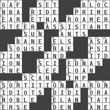 ACROSS 1. Clumsy lout 4. Arrange properly for use 7. Alliance 11. Basketball assoc. 12. Travel on an animal 13. A-one 14. Hearing organ 15. Inactive volcano in Sicily 16. Nomad 17. Bull 19. Helper 21. Player for Phoenix 23. Pismires 24. Object of repulsion 25. Raised railways 26. White ___ sheet 29. Boozer 30. Actress Charlotte 31. 23rd letter of the Greek alphabet 32. Shallow baking pan 33. Working for oneself (abbr.) 34. It would 35. Electrically charged atom 36. _-fi 37. Ferber et al. 40. Compass dir. 41. Area sheltered from the wind 42. Grant temporary use of 43. Skim 45. Naughty child 46. Conclusion 51. Composer Copland 55. Foolish or stupid persons 56. "You Light Up My Life" star Conn 58. Mouth or opening 59. Having high moral qualities 60. Liveliness 61. Make lace 62. Celtic language 63. Lair 64. A saturated hydrocarbon DOWN 1. Singles 2. Blind as ____ 3. Conductor's collection 4. Be seated 5. Pulitzer Prize-winning author Ferber 6. Afternoon social gatherings 7. Naughty children 8. Pale green bean 9. Sign of things to come 10. Foregone conclusion 12. Summer TV shows 13. Mail 16. Remove soap 18. Son of Isaac 20. First course 22. Born 24. Child's nurse 25. Bert's buddy 26. Bee-related 27. Fast planes 28. Help 29. The Jewish people; Israel 32. Make a knot 33. Ancient Celtic tribe of eastern Britain 36. Narrow boards 37. Biblical high priest 38. Kingdom 39. California wine valley 43. Took without asking 44. Quote 46. Trig term 47. Scent 48. Teases 49. Wrote a lyric poem 50. The longest river in the world 52. Round or rotation of duties 53. NW Algerian seaport 54. Nathan's nickname 57. One of the 12 tribes of Israel