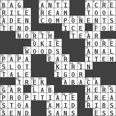 ACROSS 1. Paper or plastic container 4. Against 8. Measure of real estate 12. Cause heat under the collar 14. 480, 500 or 516 sheets of paper 15. Utensil 16. An important port of Yemen 17. Pieces 20. Look after 21. Frozen water 22. Enemy 23. 0 degrees 27. Pull apart 29. Migrant worker of the '30s 31. Greater amount 34. Forest 35. Of or related to the anus 36. Dad 39. Hearing organ 41. Detail 42. Narrow opening 43. Japanese brewing company 46. Lie 47. Russian composer Stravinsky 48. Long journey 51. Phillipine bananalike plant 54. Slender fish 56. Experiment locale 58. Possessive pronoun 61. Conciliate 66. Type of rug 67. Portico 68. Among 69. Teases 70. Transmit 71. Without 72. Double-curved letter DOWN 1. Naughty child 2. Assistant 3. American astronaut and politician John 4. Curve 5. Modern: prefix 6. Scottish cap 7. Body of Kaffir warriors 8. Had dinner 9. Meet 10. Printing process, for short 11. Otherwise 13. Inside; within (prefix) 18. Sep. follower 19. Born 24. Friend of Pooh 25. Ring climax 26. Flintstone garb 28. With great haste 30. 1973 Nobel Price Winner (Physics) Leo 32. Actress Charlotte 33. Shade tree 34. Wetness 36. Pacific Standard Time (abbr.) 37. According to 38. Characterized by complete cowardliness 40. Port city in Latvia 44. Director Reiner 45. Retirement account (abbr.) 49. Biblical high priest 50. Krazy ___ of comics 52. Burn to charcoal 53. Nest on high 54. Global Positioning Systems (abbr.) 55. Johnson of "Laugh-In" 57. Prejudice 59. Confederate soldiers (slang) 60. Backtalk 62. Writing tablet 63. Housemaid (var.) 64. Shallow baking pan 65. Begley and Asner