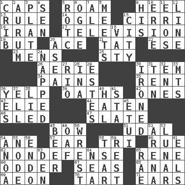 ACROSS 1. Smile enhancers 5. Wander aimlessly 9. The bottom of a shoe or boot 13. Court order 14. Stare 15. High-altitude cloud 16. SW Asia republic 17. Boob tube 19. Yet 20. Adept person 21. Make lace 22. Compass dir. 23. Not women's 25. Filthy place 26. Nest on high 30. Detail 34. Aches 35. Monthly bill 36. Sharp bark 39. Curses 42. Washington bills 43. Writer Wiesel 44. Consumed 46. Downhill vehicle 47. Chalkboard 48. Arrow shooter 51. Freehold land 54. A saturated hydrocarbon 57. Ewer handle 58. Three (prefix) 60. Regret 62. Unrelated to defense, as in spending 65. French philosopher Descartes 66. More peculiar 67. Oceans 68. Of or related to the anus 69. A really long time 70. Small pie 71. Hearing organs DOWN 1. Baby bed with high sides 2. Gold (Symbol: Au) 3. Food holder 4. Elected rep. 5. College mil. group 6. Double curve, resembling the letter S 7. Everything 8. Confronts 9. Part of HMS, perhaps 10. 4th largest of the Great Lakes 11. Greek god of love 12. Actor's bit 15. Municipality 18. Large container 20. Toward the sea 24. Slept 27. River (Sp.) 28. _ tizzy (2 wds.) 29. _____ Park, CO 30. Pressed 31. "___ Little Indians" 32. Compass dir. 33. Mountains (abbr.) 36. Consenting reply 37. Pipe bend 38. Falsehood 40. Actor Linden 41. R.R. building 45. Needle case 48. Fermented drink made from hops 49. Clumsy lout 50. Take or capture by force 52. Sports stadium 53. Type of eclipse 54. Small Philippine buffalo 55. Connecting point 56. Inside; within (prefix) 58. Russian ruler of old 59. State of inaction 61. Snakelike fish 63. Lair 64. Teachers' org. 65. Actress Charlotte