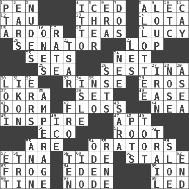 ACROSS 1. Animal enclosure 4. On the rocks 8. Actor Baldwin 12. The 19th letter of the Greek alphabet 13. Through, poetically 14. Globular water bottle used in Asia 15. Zeal 18. Beverages made from leaves 19. "I Love _" 20. Elected representative 22. Chop off 23. Puts into a specified state 24. Fish or hair follower 25. Ocean 26. French poetic form 30. Falsehood 33. Remove soap 36. Greek god of love 37. Gumbo ingredient 39. Put into a specified state 40. Comfort 41. Dormintory (informal) 42. Soft thread for cleaning between teeth 44. Teachers' org. 45. Motivate 47. Fitting 50. Environmental prefix 51. Carrot, for example 53. "We ___ not amused" (Victoria) 54. Speakers 57. Inactive volcano in Sicily 59. Event that recurs at intervals 61. Lacking originality or spontaneity 63. Tree-dwelling hopper 64. Genesis locale 65. Electrically charged atom 66. Prong on a fork 67. Thickened enlargement 68. Directed DOWN 1. Parent Teacher Assoc. 2. Hearing organs 3. Unadorned figures 4. "Tell ____ the Marines!" 5. "Mermaids" star 6. Epoch 7. Two (Sp.) 8. One to whom something is allotted 9. Central Nebraska county 10. And so on (abbr.) 11. Island 16. Singles 17. Pace 21. Russian ruler of old 22. French article 24. Born 26. Fast planes 27. SW Asia republic 28. Olfactory organ 29. Toward the sea 30. Farming town in central California 31. Visual representation of an object 32. Blunders 34. Small island 35. Modern: prefix 38. Electrical Measurement 42. Away 43. "Two Mules for Sister ____" 46. Frozen water 48. Cooking vessels 49. A blast of a horn 52. Lag or linger behind 53. At once, immediately (arch.) 54. Wrote a lyric poem 55. French philosopher Descartes 56. A type of plum 57. Lizard (obsolete) 58. Three (prefix) 59. "___ Little Indians" 60. Wedding promise 62. Conclusion
