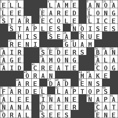 ACROSS 1. Pipe bend 4. Unable to walk 8. Small Philippine buffalo 12. Area sheltered from the wind 13. Having ears or earlike features 14. Yearn 15. Play the lead 17. Learning spot: Fr. 18. Louse (plural) 19. Paper fasteners 21. Annoying sounds 23. Part of HMS, perhaps 24. Ocean 26. Regret 27. Painter Guido (1575-1642) 28. Island territory of the United States 30. Atmosphere 31. Spring feasts 34. Prohibit 37. Personal question 38. Amid 39. Insect wing 40. Help 41. Cause to be 42. Gear tooth 43. NW Algerian seaport 44. Cause to be 46. "We ___ not amused" (Victoria) 47. Male parent 50. Followers of ems 51. Burden 54. Portable computers 57. Toward shelter 58. Empty; void 60. California wine valley 62. Grandmother 63. Prevent from occurring 64. Feline 65. Relating to the mouth 66. Observes 67. Compass dir. DOWN 1. Raised railways 2. Allows 3. Tough but pliablecoriaceous 4. Shoestrings 5. Came up 6. Cartoonist voice _ Blanc 7. Paradise 8. Plant genus of onion and garlic 9. Annoying sound 10. Single time 11. Grows older 13. Snakelike fish 16. Water falling in drops from the sky 20. 23rd letter of the Greek alphabet 22. Mouths or openings 25. Rep 27. Swiss mountan, "Queen of the Mountains" 29. Goad 30. American Automobile Association (abbr.) 31. "Two Mules for Sister ____" 32. Make improvements or corrections to 33. ___ good deed 34. Keyboard key 35. Medicinal plant 36. Tired old horse 41. Algonquian 43. Severe or trying experience 44. Was introduced to 45. At once, immediately (arch.) 46. Sports stadium 48. Having winglike extensions 49. Natives or inhabitants of Denmark 51. Papal veil 52. Having or resembling wings 53. Hats (slang) 55. For each 56. Connect, as a bridge 59. Born 61. Had dinner