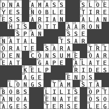 ACROSS 1. Heredity factor (abbr.) 4. Collect or gather 9. _ gin 13. It is so 14. Having high moral qualities 15. Hoop that covers a wheel 16. Curvy letter 17. Believer in; advocate of (suffix) 18. ____ Jay Lerner 19. Part of HMS, perhaps 21. Baseball player Mel 22. Composer Copland 24. Connect, as a bridge 26. Compass dir. 27. Brizilian seaport 29. Russian ruler of old 30. Declaim 31. "Two Mules for Sister ____" 33. Three (prefix) 36. Lair 37. Eat 40. Rowing implement 41. Erode 42. Yawn 43. Having winglike extensions 45. Seaweed 47. Amusement-park features 48. Personal question 49. Extremities 50. Yearns 52. Scottish cap 54. R.R. building 56. Moves up and down 57. Ms. Damita and namesakes 59. Elect 61. Small Philippine buffalo 62. Related on the mother's side 63. Bear (Spanish) 64. Eons 65. Laconic 66. Part of a journey DOWN 1. Color 2. Soft 3. Aide 4. Santa ___, CA 5. Person of subnormal intelligence 6. "This won't hurt ____!" 7. Narrow board 8. Elected rep. 9. A viewer who gazes fixedly 10. _ and Stitch 11. Northwest Algerian city 12. Car or cant ending 20. Argument over a trivial matter 22. Indian state 23. White ___ sheet 25. Actor Baldwin 27. Thickened enlargement 28. Type of rug 29. Loyal 31. Fastener 32. Cleo's killer 33. Inedible or poisonous agaric 34. Assign a rank or rating to 35. Angers 38. Stares 39. Merit 44. Flaplike coverings 45. Sunflower state 46. Oval reproductive body of a fowl 49. Gives off 50. Yearn 51. Mitch Miller's instrument 52. Prong on a fork 53. Having or resembling wings 55. Domed church section 56. Sound made by sheep 57. Allow 58. Observe 60. Coat; cloak